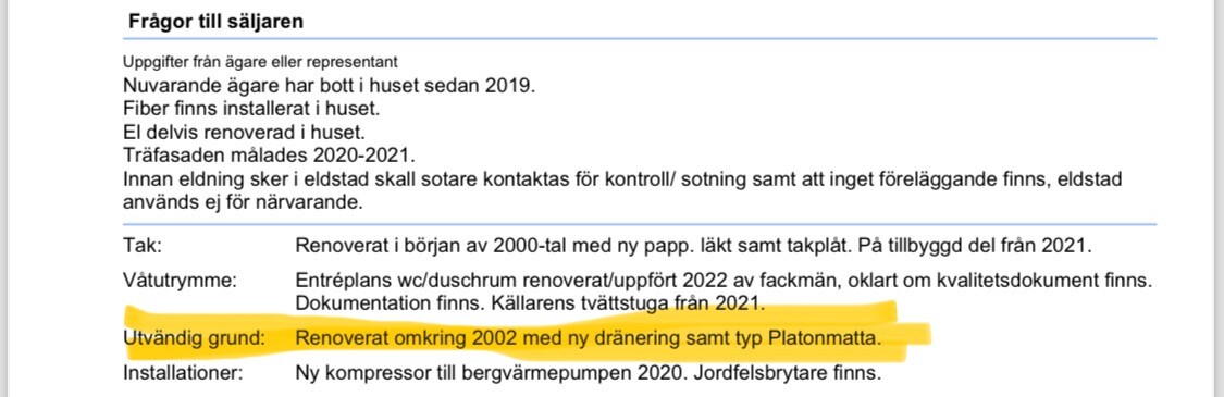 Jag och min sambo köpte hus för lite drygt ett år sedan. I objektsbeskrivningen och besiktningsprotokollet står det tydligt att huset omdränerades runt 2002 med ny platonmatta.