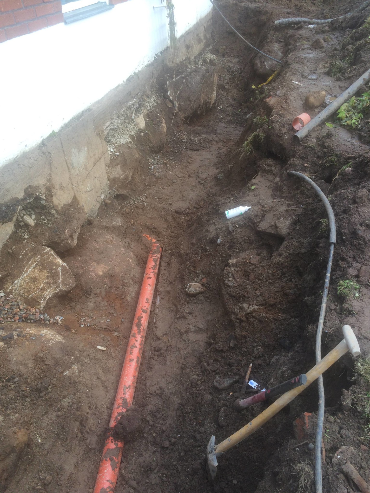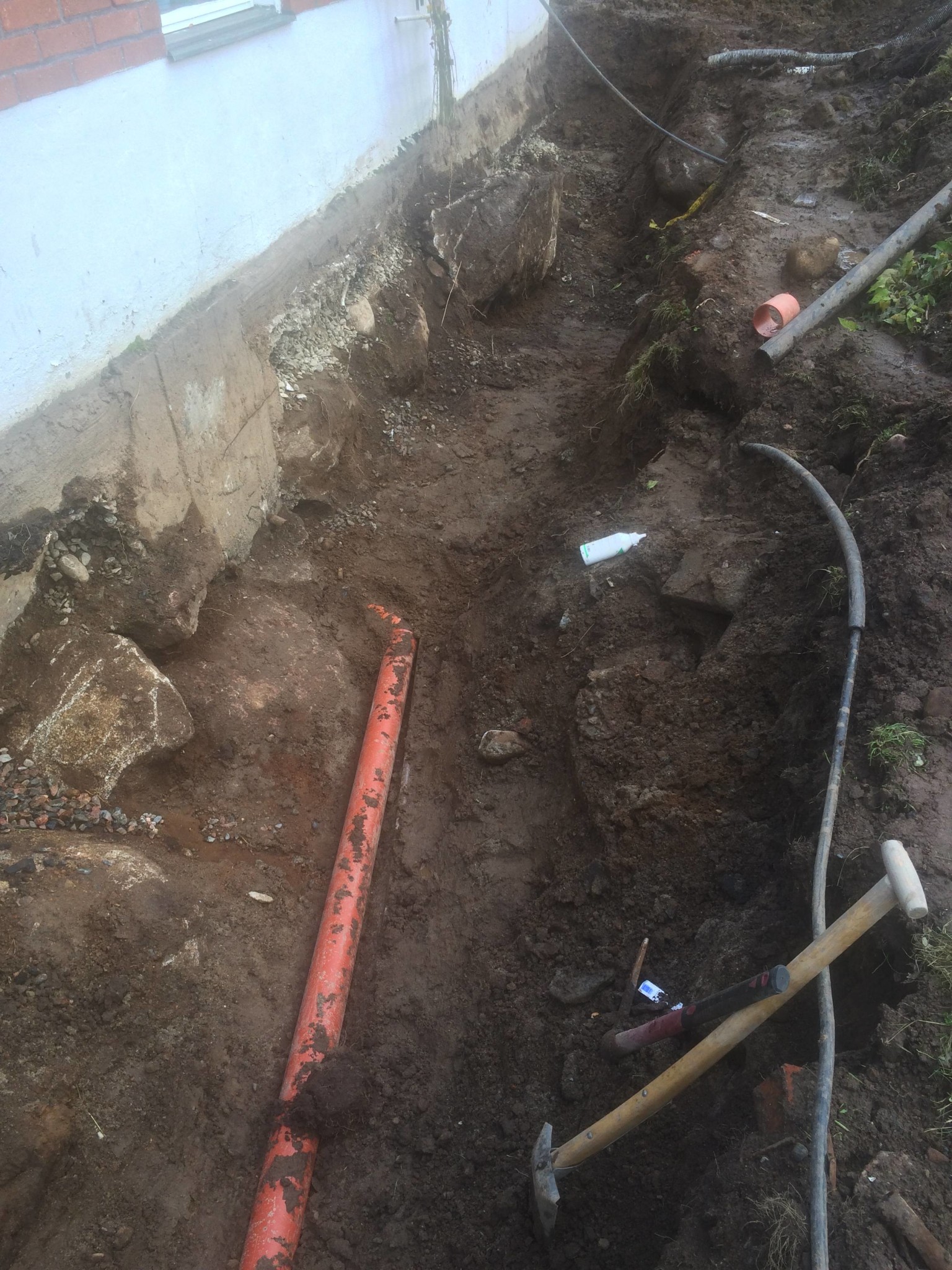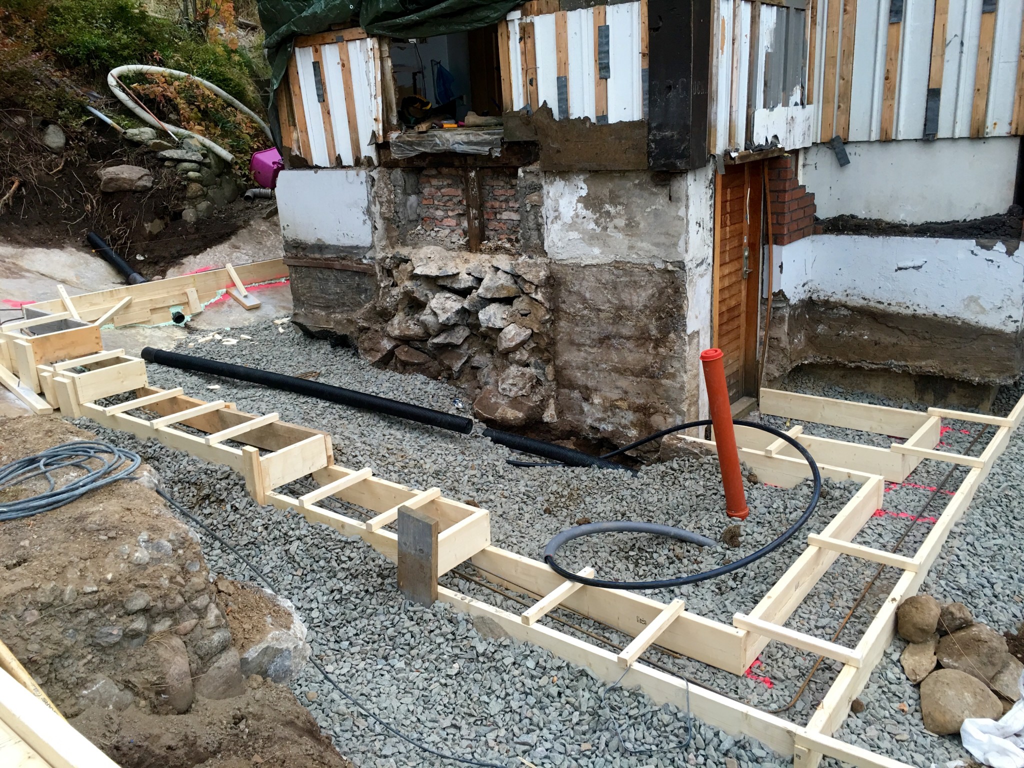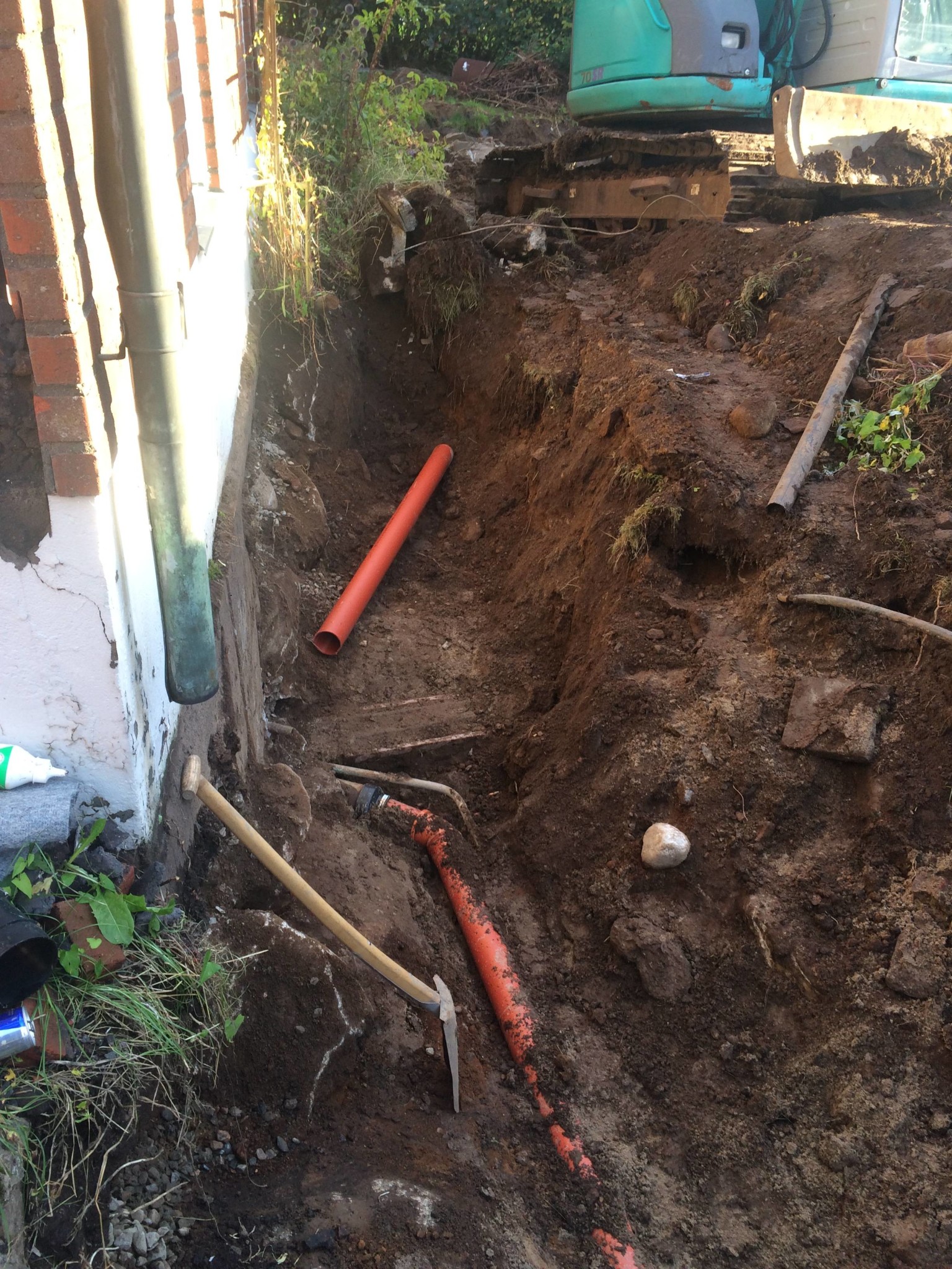 På bilden med tillbyggnaden ser jag dränrör isf men inte mkt att gå på.