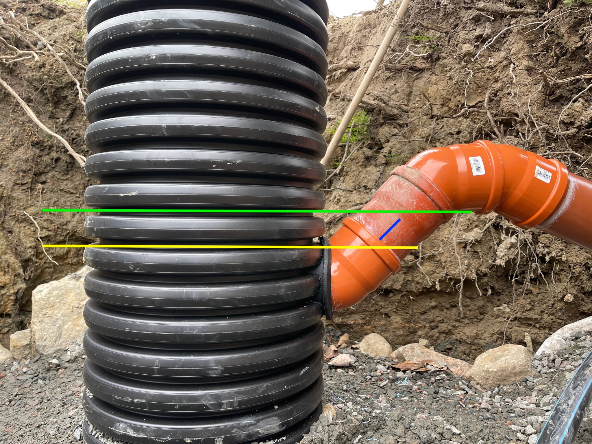 * Jag tänker att jag inte behöver ha så lång rak bit mellan böjen som kommer ur brunnen, utan jag kan kapa den raka rörbiten några cm så att den den del av röret vid den blå linjen försvinner?