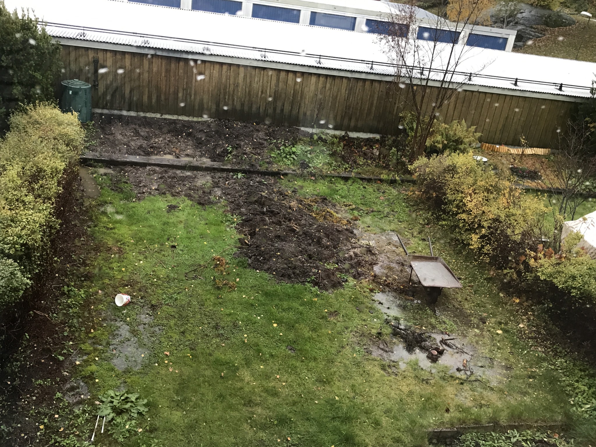 Bor i ett radhus, med baksida, gräsmatta, som går mot en garagelänga. Nära garagelängan, ca 1 m från garagevägg, så plaskar det när man går i gräsmattan och man liksom sjunker ned även när det inte har regnat på länge. Regnar det så bildas det pölar som efterhand sjunker bort. Alltså förstår vi att vi har något problem med dräneringen.