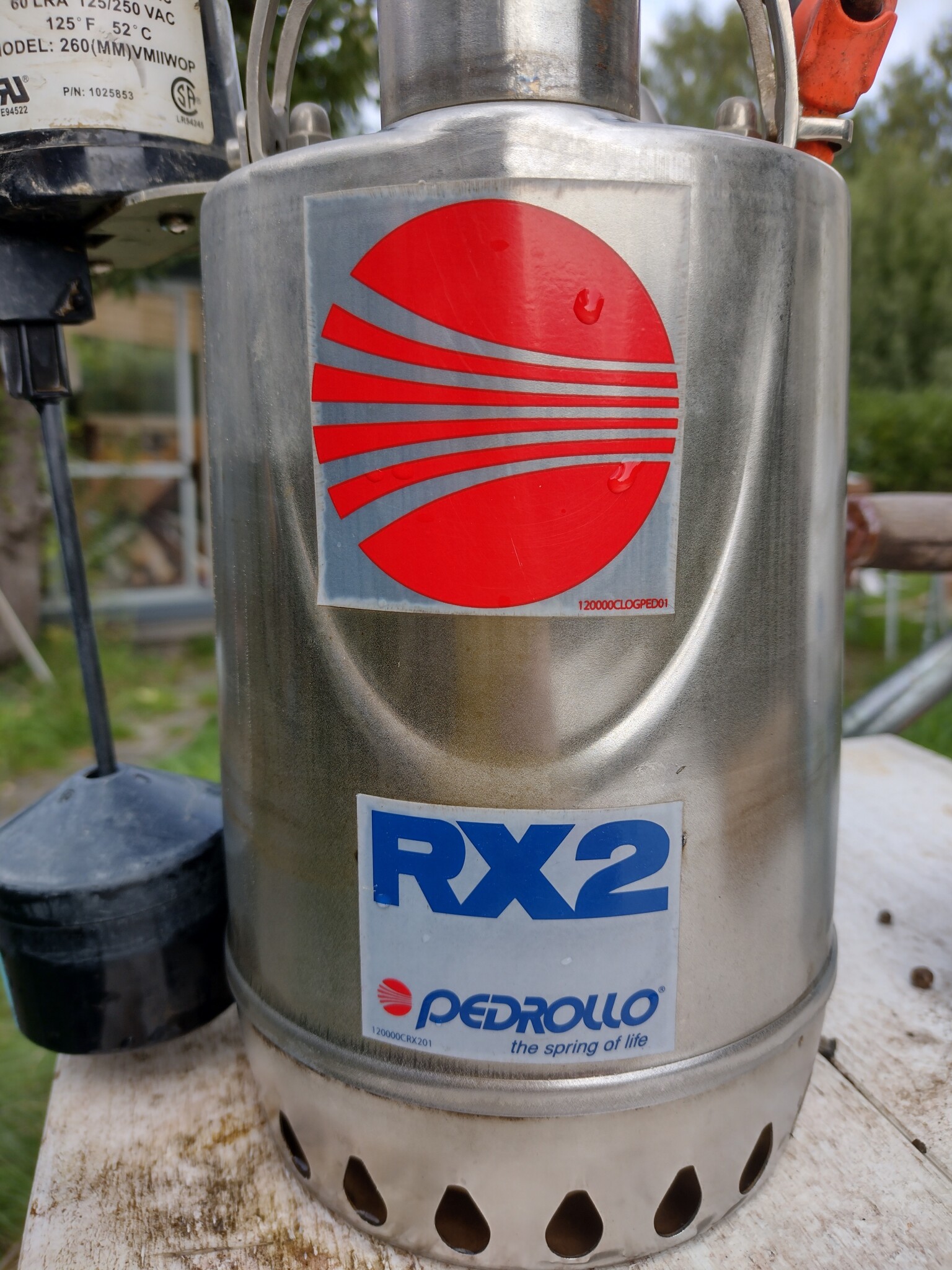 I och med att fastigheten dränerades 2017 installerades även en ny pumpbrunn tillsammans med en Pedrollo RXm2 (vertikalvippa) i brunnen. Pumpen har gått igång de gånger vattennivån hamnat strax över pumphuset då flottören varit rätt inställd. Har inte haft några som helst problem med pumpen förrän den helt plötsligt stannade under augusti månad 2023. Då hade vatten gått över pumphuset (som ska vara helt tätt), och en bra bit upp i brunnen vilket resulterade i att brunnen blev lite överfull med vatten ett par veckor. Som tur var hade jag en extra pump i garaget som jag kunnat använda efter att jag monterat bort Pedrollon. Elen till brunnen har varit avsäkrad och jordfelsbrytare har använts.