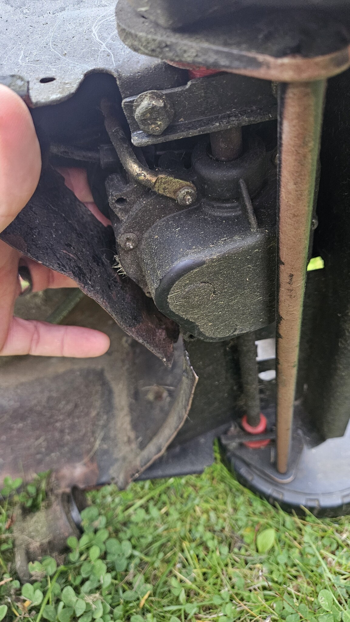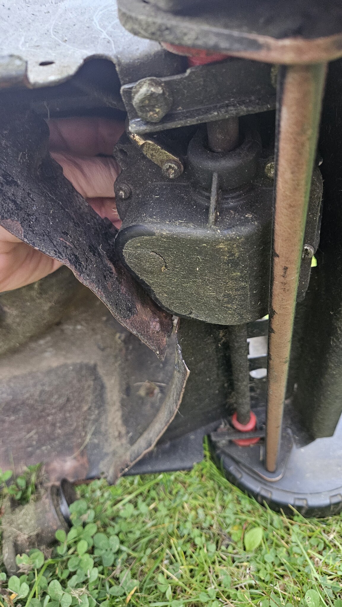 Tack för svaret. Efter närmare titt, se det ut som att plåten till vänster är en del av konstruktionen som hindrar att kopplingshöljet roterar såpass att remen tappar spänning. Plåten som också tar stryk av främmande föremål som slåss av bladet. En märkligt konstruktion.