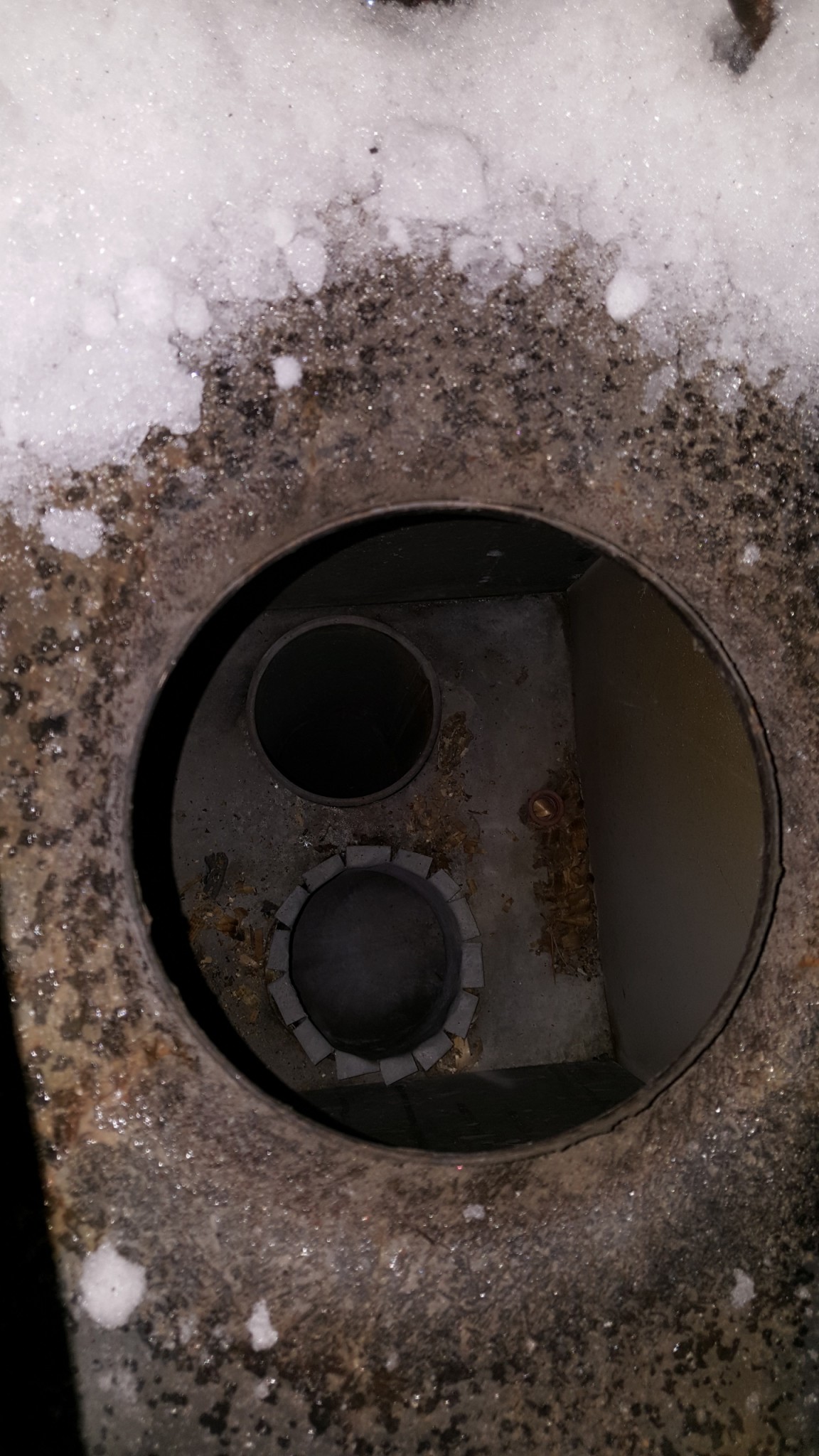 Bifogar en bild uppifrån "skorstenen" där man ser två rör, och de ena ska gå till köksfläkten.