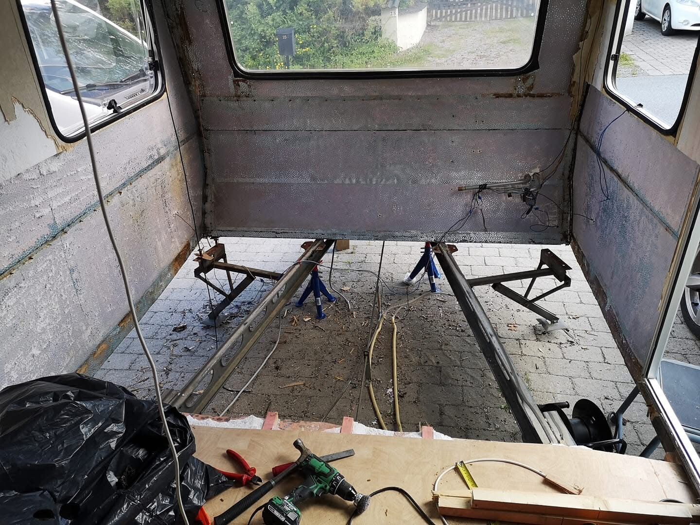 Man börjar rensa inredning. Väggar och isolering tas bort. Glädjen är stor när de för 30 år sedan använde 2 ton lim till all cellplast men 2mm plywood till bärande konstruktioner som golv och annat oviktigt.