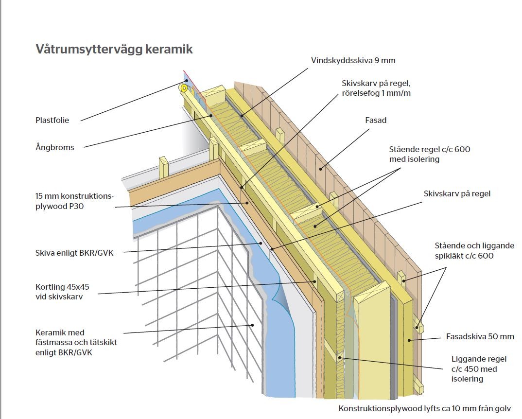 Precis. Det är en ångbroms i ytterväggen bakom badrumsväggen. I tidigare riktlinje drog man in fuktspärren och la ihop den med badrummets fuktspärr för att bara få ett lager med fuktspärr.