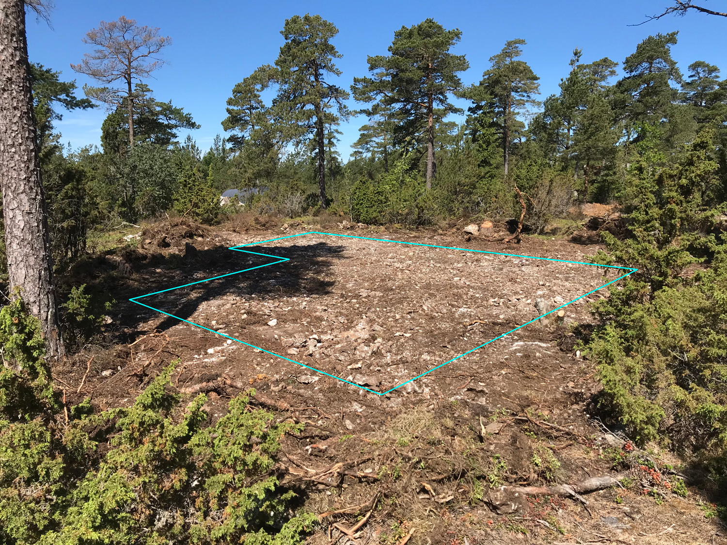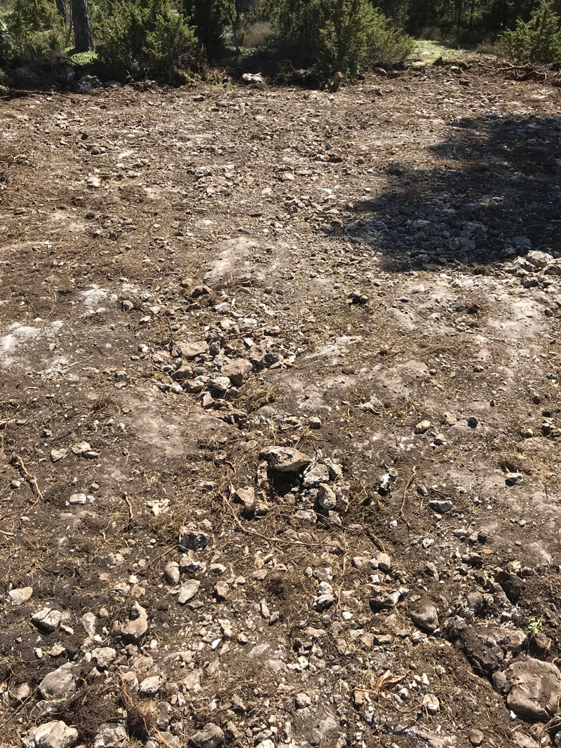 Det är en kalkstens-bergig tomt och jag har nu grävt bort ett ca 10 cm tjockt jord/gräs/rötter-täcke på platsen för huset. Under detta är det partier med berg och däremellan sten.