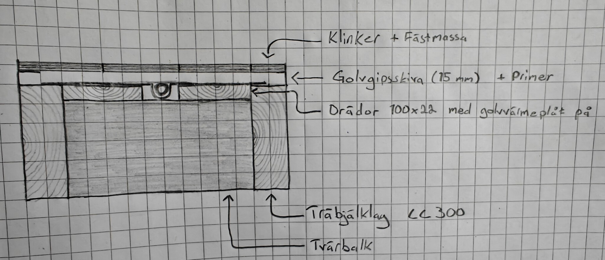 I en hall på cirka 6 m² där jag ska ha klinkergolv, går det att bygga som jag tänkt på bilden? (Golvbjälklag: cc300, tvärbalkar med brädor och golvgips)