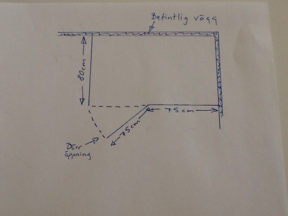 Mått på väggen är 80x150cm (se ritning) Går även att ställa rak och blir således 230 cm vägg.