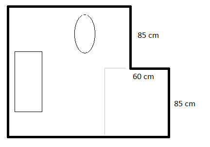 Hej, vi håller på att planera ett badrum o har kommit fram till att det blir bäst med en duschnisch - men en något osymmetrisk sådan (nedre högra hörnet på ritningen nedan, toastol mitten uppe och handfat till vänster). Då toan kommer rätt nära den korta glasväggen skulle jag vilja göra den vikbar in i duschen (snedtak åt andra hållet).