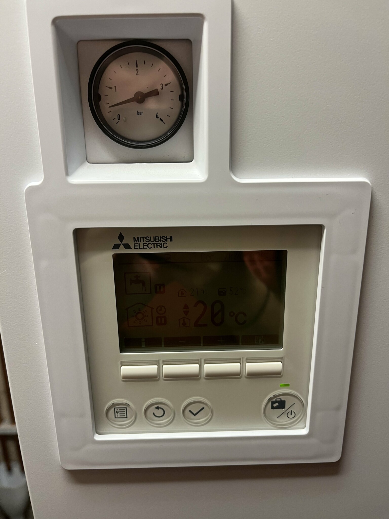 Vi har vattenburen värme i riktigt gamla element. Kopplat till detta har vi Mitsubishi Ecodan luft-vattenpump.