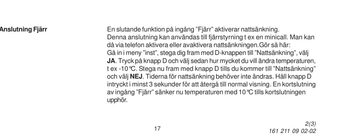 Jag har en äldre EcoEl där man kan sluta med ett relä en kontakt i den och få nattsäkning enligt manualen. I manualen står stega fram till "nattsäkning" och välj "ja" sedan stega fram till "antal grader sänkning" men sedan gå till "nattsäkning" och välj nej.