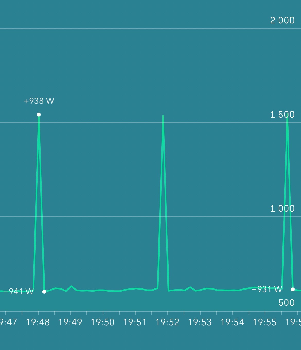 Har sedan en tid tillbaka sett spikar i effektförbrukningen och kan inte riktigt bestämma vad det är eller om det är "normalt". I bilden nedan syns effektuttaget under tidig kväll idag. Effektuttaget ligger stadigt på drygt 500 W men ca var 4:e minut kommer en spik på +1000 W. Inget speciellt är påslaget annat än hushållsel (alltid på typ kyl/frys etc), lampor, TV... Bergvärmepumpen är i viloläge och elgolvslingan i badrummet är avslagen. Under andra tider på dygnet är spikarna både mer frekventa och ibland mer sällsynta, men de finns där hela tide. Har farit runt och stängt av än det ena än det andra och det verkar vara en elradiator i dotterns rum som orsakar detta mönster. Rummet håller drygt 20 grader C och termostaten är inställd för den temperaturen. När jag stänger av radiotorn så verkar spikarna försvinna. Är detta normalt eller är det en indikation på att något kommer balla ur snart?