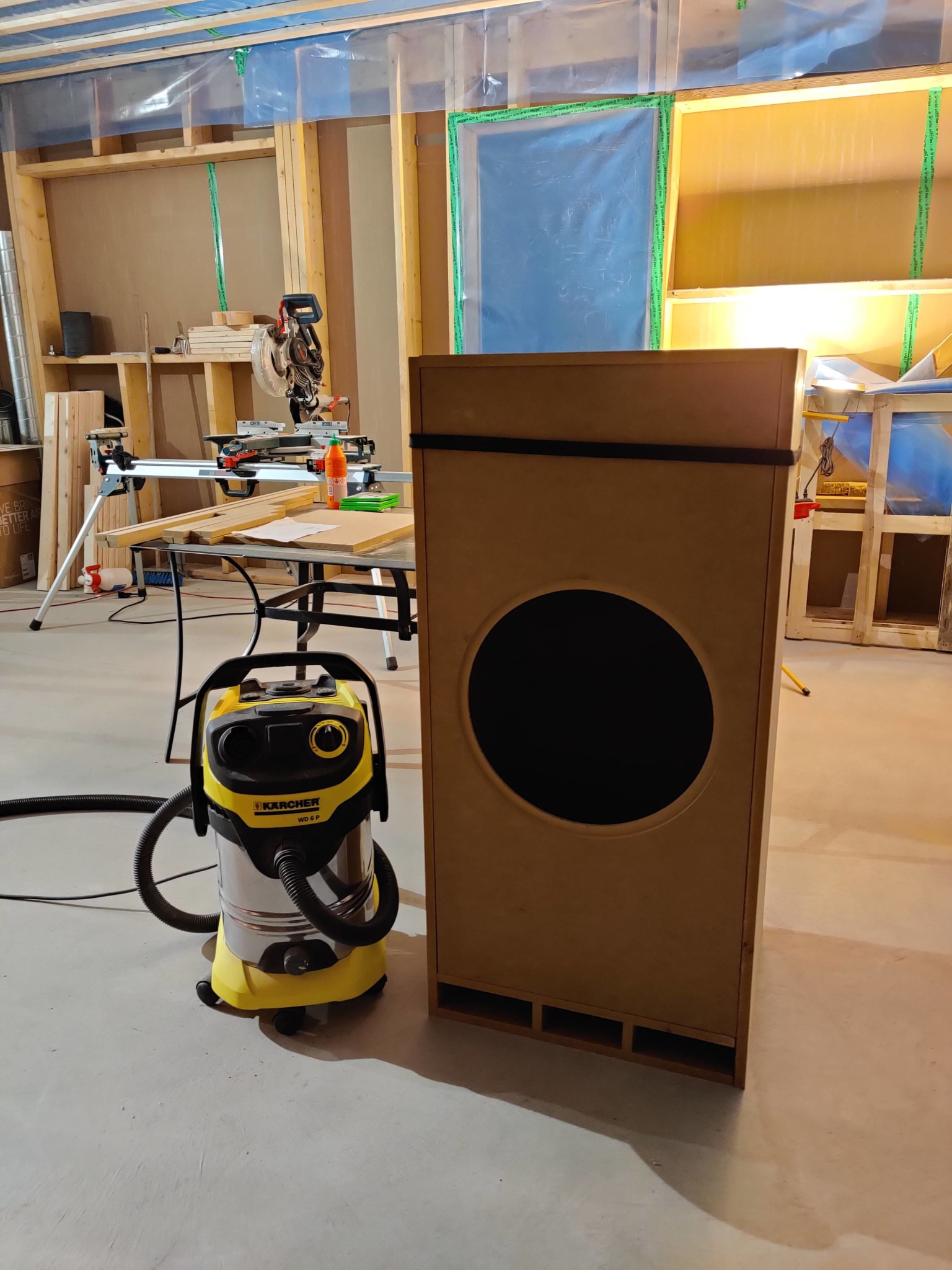För några dagar sedan blev högtalaren färdigt monterad så vi bar upp den och ställde den på plats för att kunna provspela lite innan jag lägger ner mera tid på en fin finish.
