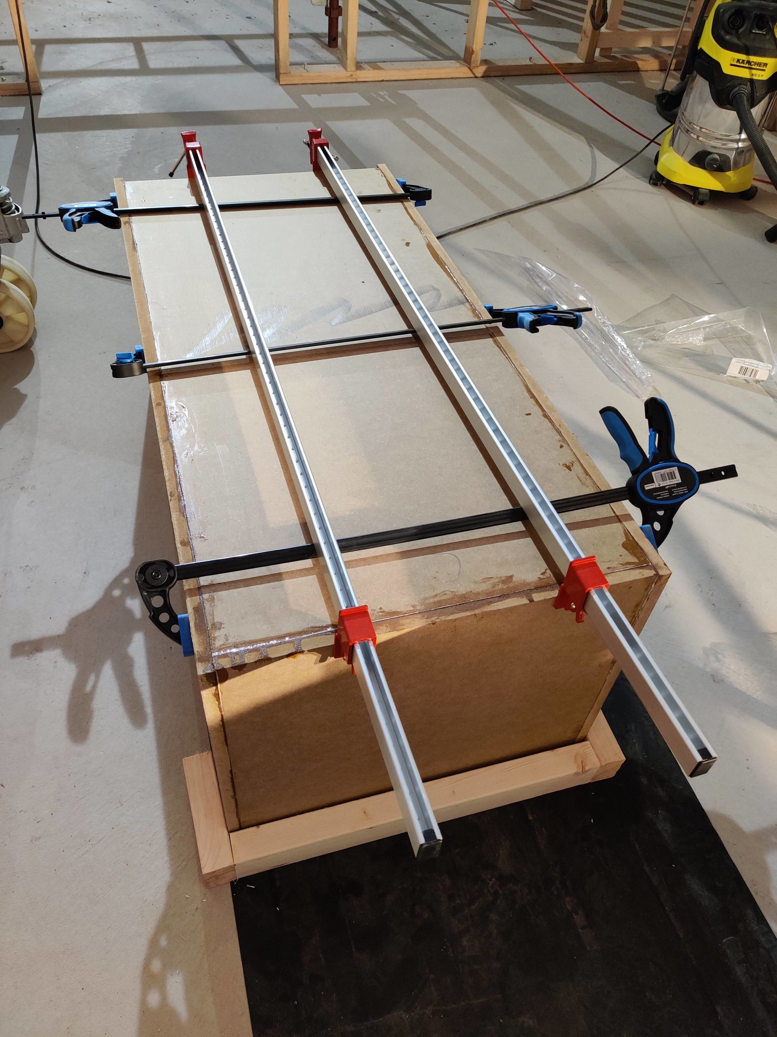 Har ikväll limmat ihop sidor, bakstycke och botten och kommer fortsätta med topp och portarna imorgon. Köpte lite stora skruvtvingar och limknektar idag för att kunna limma, men ta mig tusan att det skulle ha behövts åtminstone en till så jag fick bygga en extra "skruvtving" istället...