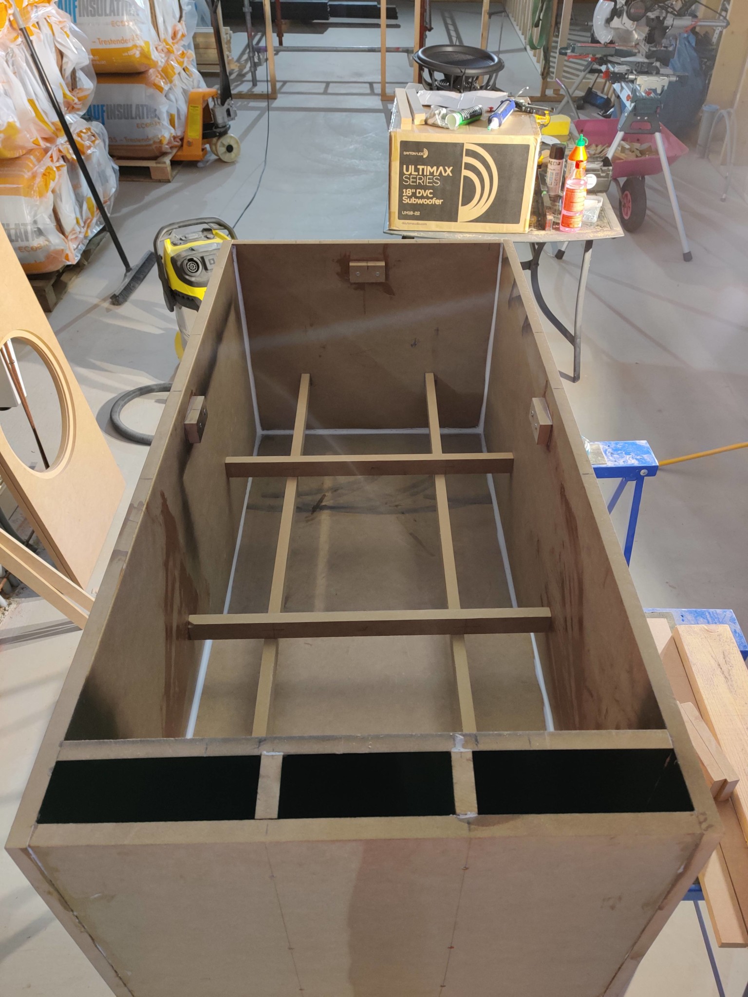 Så vad gör man? Man fortsätter med baslåda 1 av 2 och limmar det sista: dubbelbaffeln. Imorgon ska jag stoppa i element och sen tänker jag provspela lådan ett litet tag innan jag bygger en andra, och först när den är klar målar jag dem.
