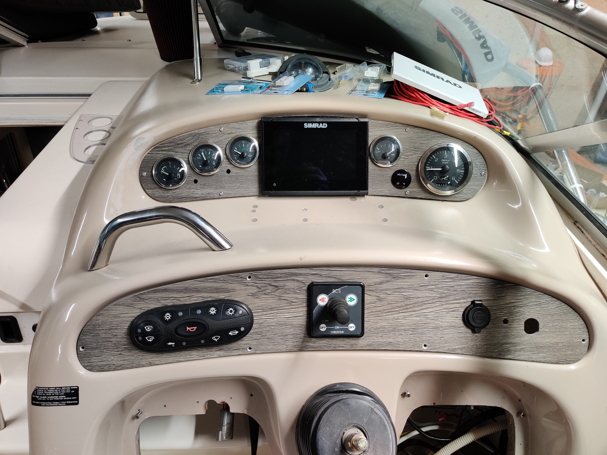 Och allt eftersom sommaren kommer närmare så försöker jag få in lite tid i båten så vi får den i sjön någon gång. Har gjort en hel del framsteg så nu börjar elsystemet vara klart, och så börjar de nya instrumentpanelerna vara klara. Fräste först ut dem i polykarbonat som jag hade tänkt foliera, men jag tyckte inte det blev snyggt och det var väldigt svårt att få till det med de runda formerna. En dag när jag var nere i garaget gick jag förbi pallen med vinylgolv som ligger och väntar på att läggas i huset. Tog någon av spillbitarna och provade fräsa ur paneler ur dessa, och det blev jag fantastiskt nöjd med direkt!