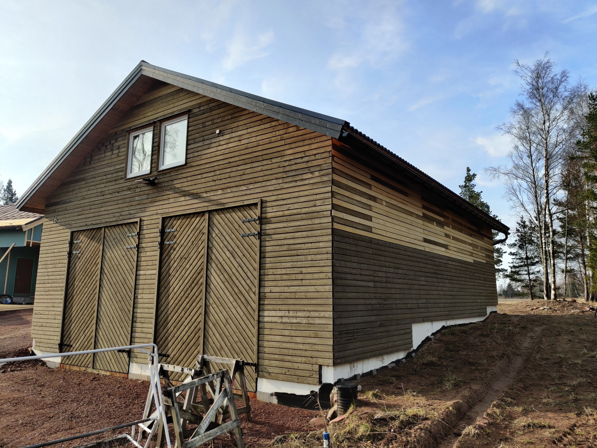 Vi har även äntligen fått upp all panel på garaget, så där lagom 11 månader efter att vi flyttade in! Det var ju nämligen så att den panel vi fick när vi tog första lasset till garaget var 480 cm lång, och när den tog slut fick vi veta att det var en ovanlig längd hos sågverket så det dröjde ända tills sent i höstas innan de orkade såga upp en ny knippe. Och eftersom vi ju redan hade spikat upp panel med skarvar på specifika ställen ville jag inte börja med kortare brädor och skarvar på helt andra ställen... Så när vi väl fick panelen sent i höstas var det inte riktigt läge eftersom vi höll på och reste huset, och när vi väl hade fått det tätt var det inte längre väder att vitriola... Så det har fått vänta tills nu, och nu är det äntligen klart! Ser lite kul ut nu med en vägg vars panel delvis utsatts för sol i över ett år, och delvis är helt färsk. Men redan på några veckor nu har skillnaden blivit betydligt mindre.