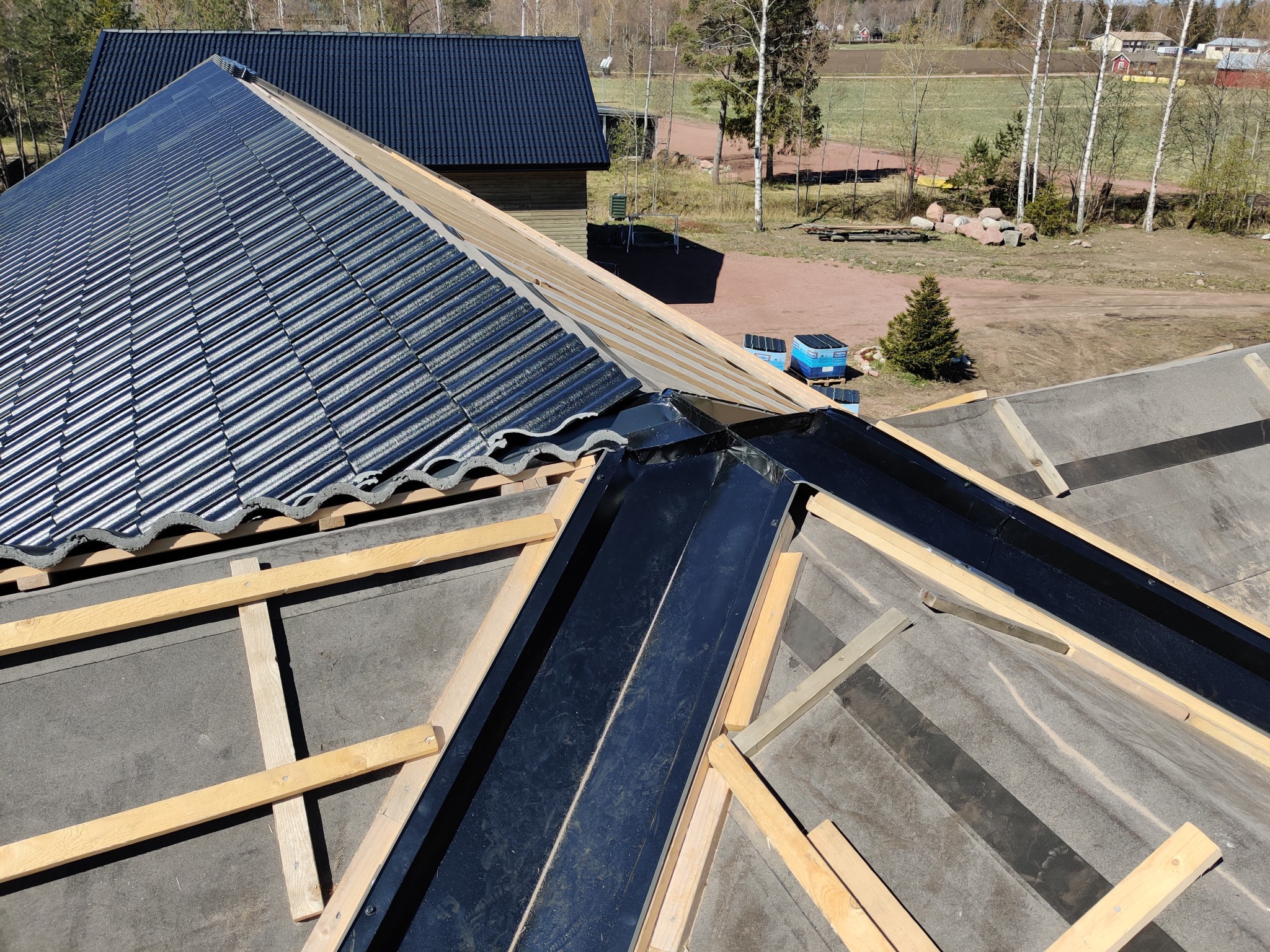 Fick hit en kompis som är före detta plåtslagare i lördags och han fixade ihop alla ränndalsplåtar i nocken. Han hade aldrig gjort det förut så jag visade en bild jag googlat fram och för att ha varit första gången han gjorde det utan tillgång till alla verktyg han egentligen velat ha så tyckte jag det blev riktigt bra. Det ska ju ändå täckas av pannor...