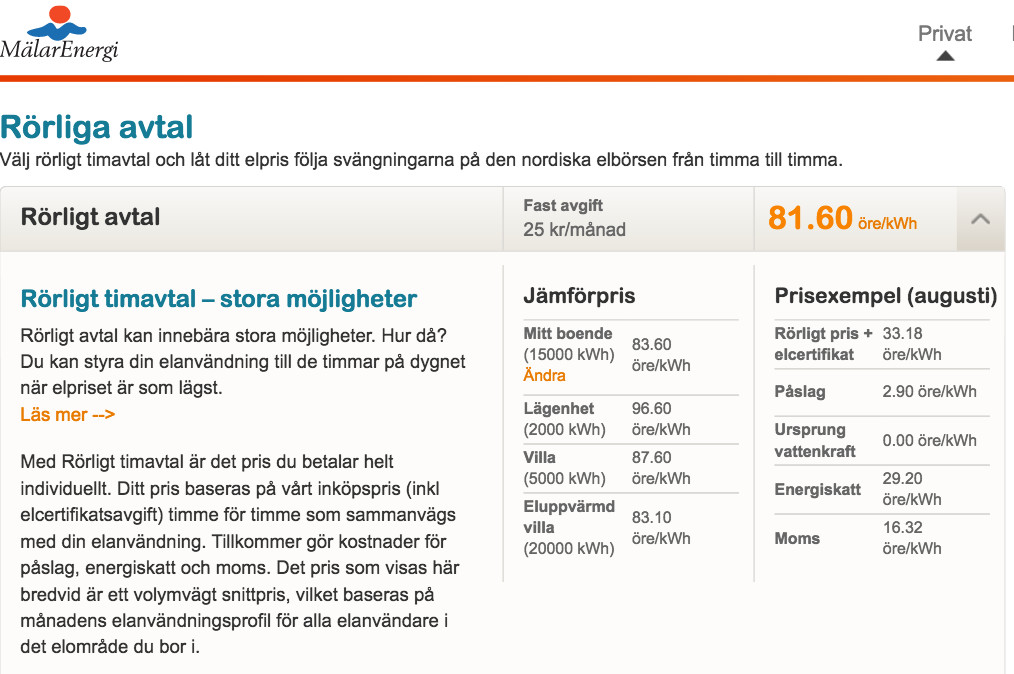 Ja något är det som inte stämmer. I spottpriset på 29.8 öre är avgift för elcert inte inkluderad.Däremot är den det i Mälarenergis erbjudande på nätet. Där framgår ganska föredömligt hur de tar betalt tycker jag. Det rörliga elpriset inkluderar spot och elcert. Antagligen är dock mellanskillnaden mellan spot (28,9 öre f.n.) och det rörliga pris som inkluderar elcert (33,18 öre) något större än kostnaden för elcert. Det innebär att Mälarenergi, som många andra, skär emellan lite där utan att redovisa det.Lewdis skrev: