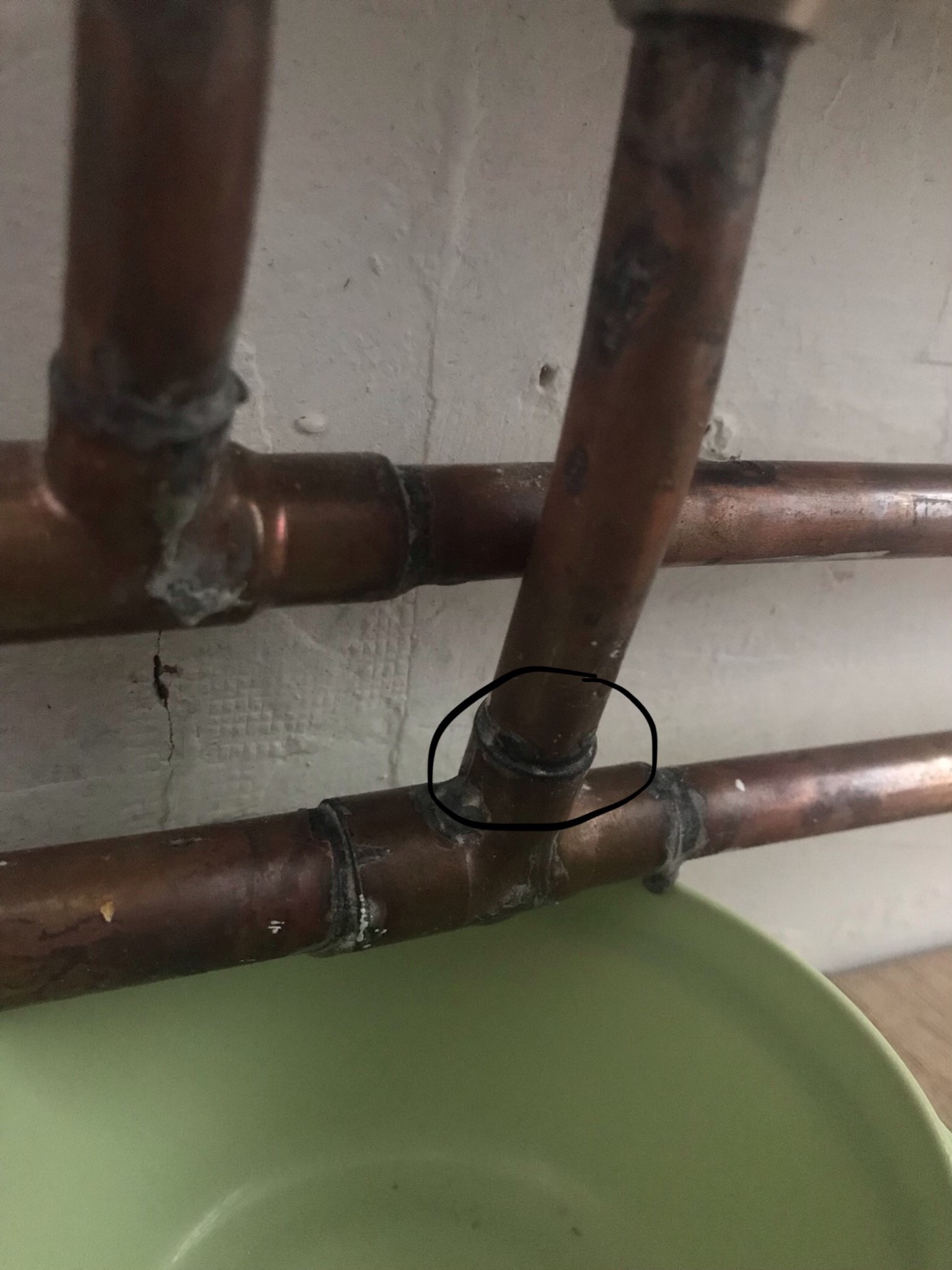 Tycker det ser ut som att lödningen inte har blivit bra då även det andra t-röret har lite ärg i skarven. En VVS:are borde kunna svar på om man kan värma röret igen för att få det tätt. Har du kollat eventuella andra lödade kopplingar i huset?