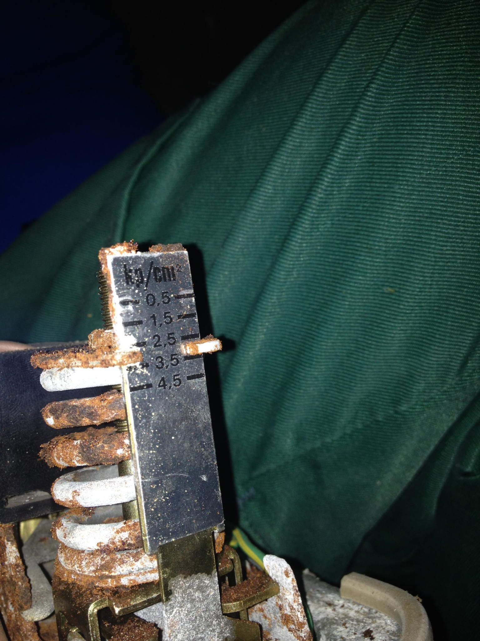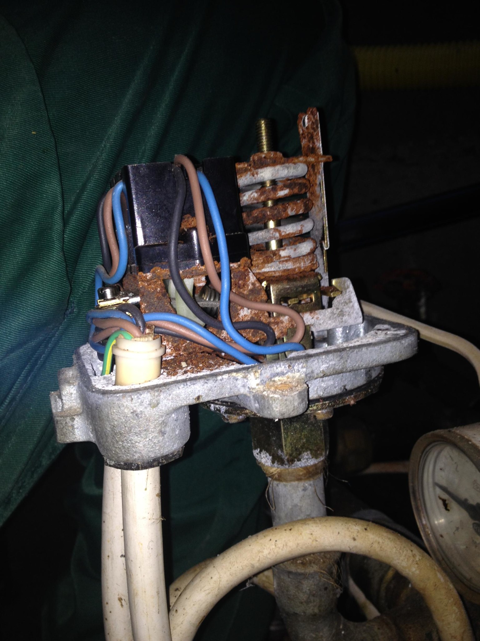Tryckströmbrytaren ser verkligen ut att vara förstahandsvalet till trolig orsak. Hoppas du har ett fungerande motorskydd så inte motorn skadats. Kan vara intressant att kolla motoranslutningen också med tanke på hur det ser ut här.