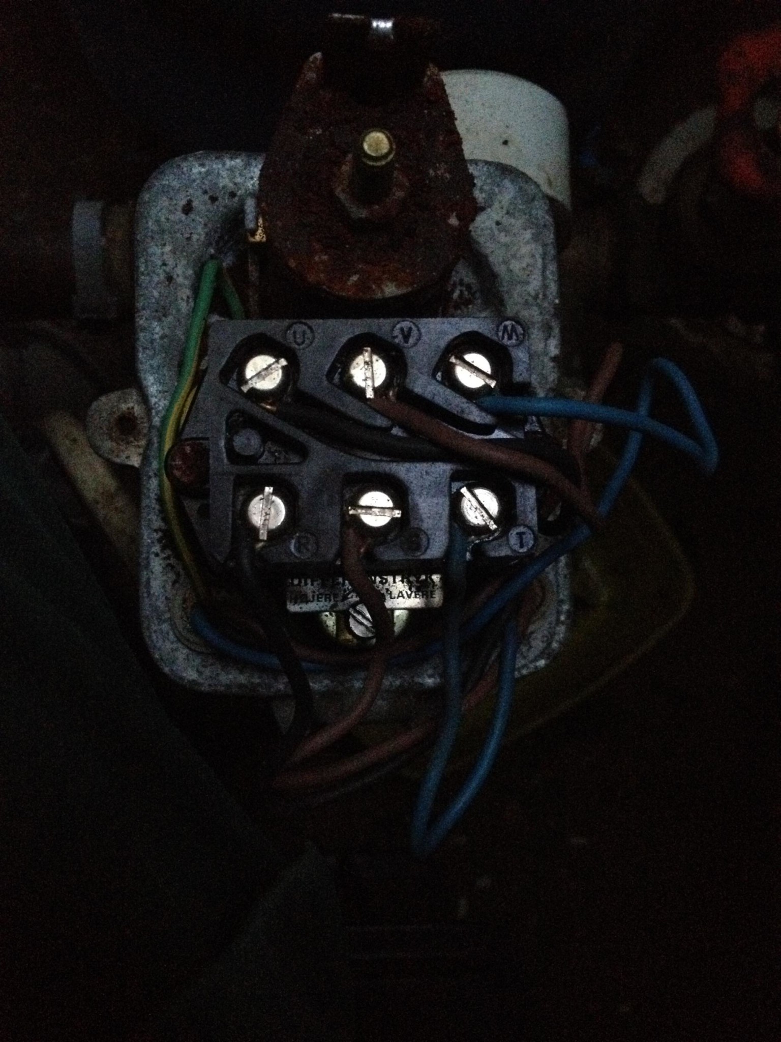 Elmont, hur mäter jag att alla faserna är med till pumpen enligt ditt förslag? Är inte bra på el men ska få hjälp att kolla det imorgon så förslag på hur man gör detta uppskattas. Konstaterar även att tryckströmbrytaren inte är snygg om man lyfter på locket, se bifogade bilder. Bild 1 = pumputrymmet, bild 2 = pumpmodell, bild 3 = tryckbrytare om man lyfter på locket, bild 4 = tryckbrytaren/trycknivå, bild 5 = tryckbrytarens kopplingsplint för 3-fas. Kabel från på/av kommer in på plint R + S + T + jord, kabel till pump går till plint U + V + W.//Joakim