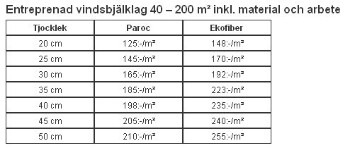 Håller på och funderar just nu på om jag ska spruta eller sätta skivor (nytt tak 45grader). Med ovanstående priser så verkar det ju högintressant att spruta ekofiber. Men hittade tex denna prislista hos www.feab.se och då ser det inte så billigt ut längre.Krille4 skrev:Deras aktuella totalpriser är enligt följande inklusive moms och ROT-avdrag (Gäller om ytan är minst 80 kvm)