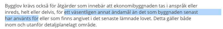 Då undrar jag över hur det funkar i de fall som en näringsfastighet med en eller flera ekonomibyggnader görs om till en privatbostadsfastighet. Hur hanteras byggnaden/byggnaderna, är det ren formalia så som en enkel ”omklassning i registren” - eller ska det ske någon form av bygglovsprocess…?