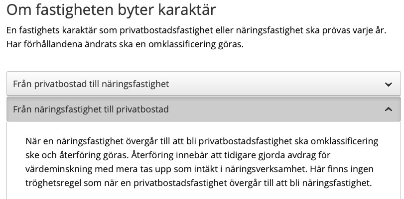 Ja, det är Skatteverket som sköter omklassningen från näringsfastighet efter avstyckningen. Skatteverket är välsignat ointresserade av det som ligger utanför deras område, dvs bryr de sig inte om bygglov och sådant alls.S Tommy66 skrev:OK, förnuftigt/logiskt förfarande!Att ekonomibyggnad/er går från att klassas som det till dito komplementbyggnad, per automatik i ett scenario där fastigheten görs om från näringsfastighet till privatbostadsfastighet.