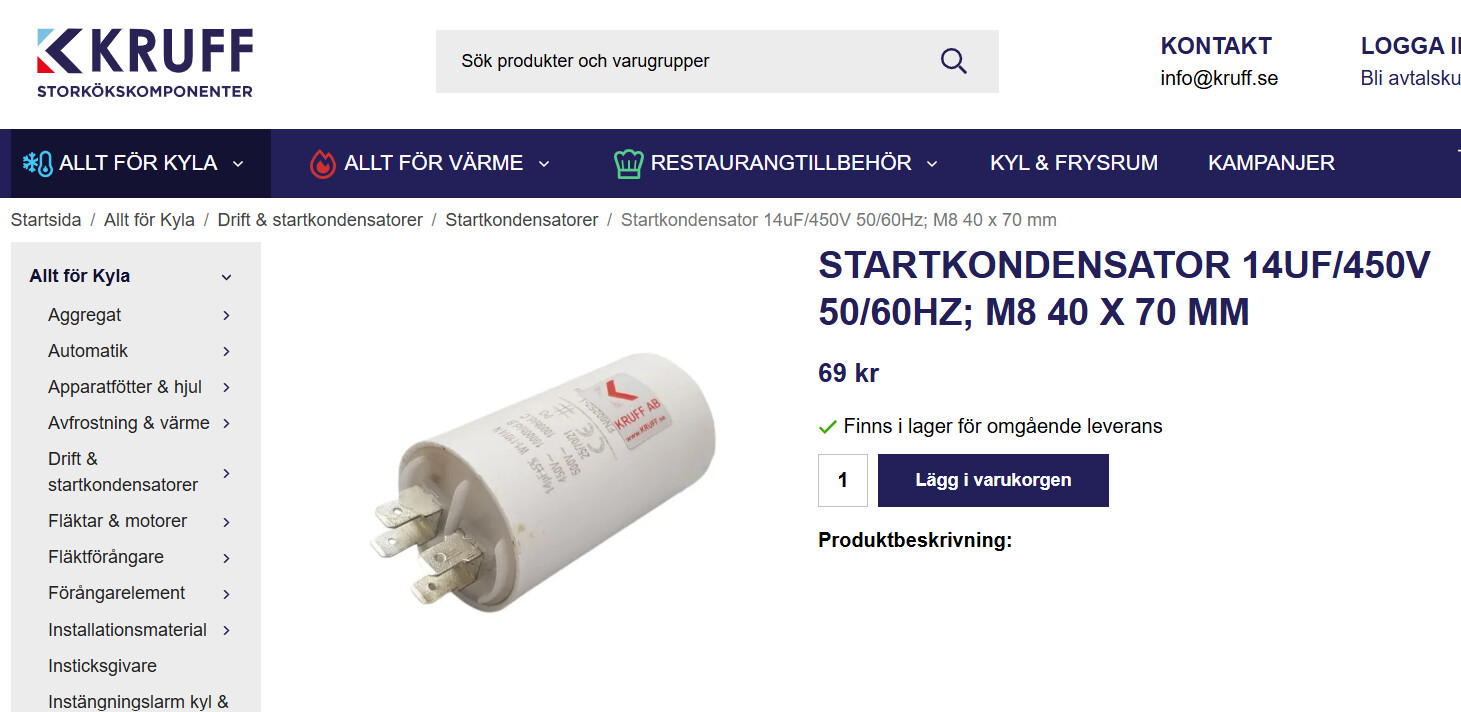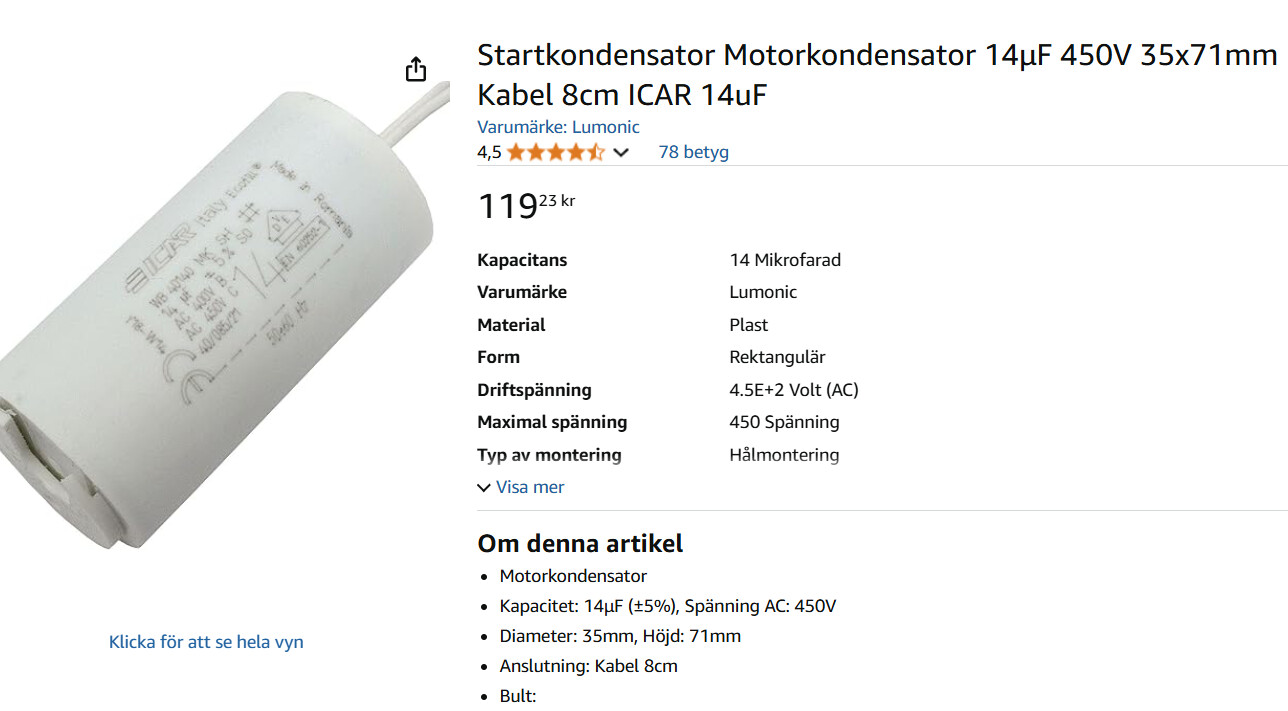 Kan nog stämma, bilderna brukar visa den faktiska komponenten. Och startkondensatorer är rätt generiska delar, så du kan säkerligen få tag på nåt som passar även om originalreservdelen utgått. Troligen mycket billigare dessutom.Bronken skrev: