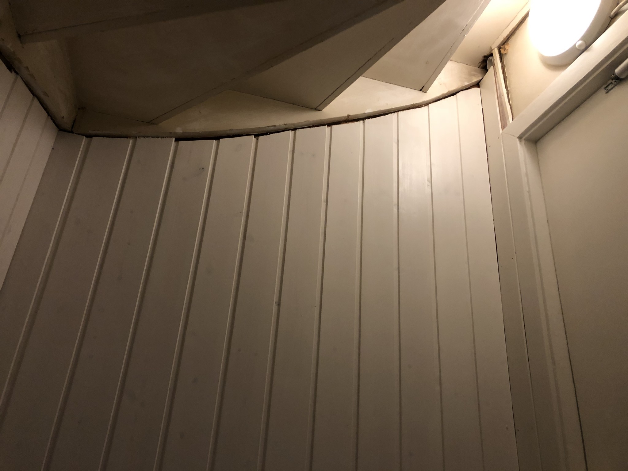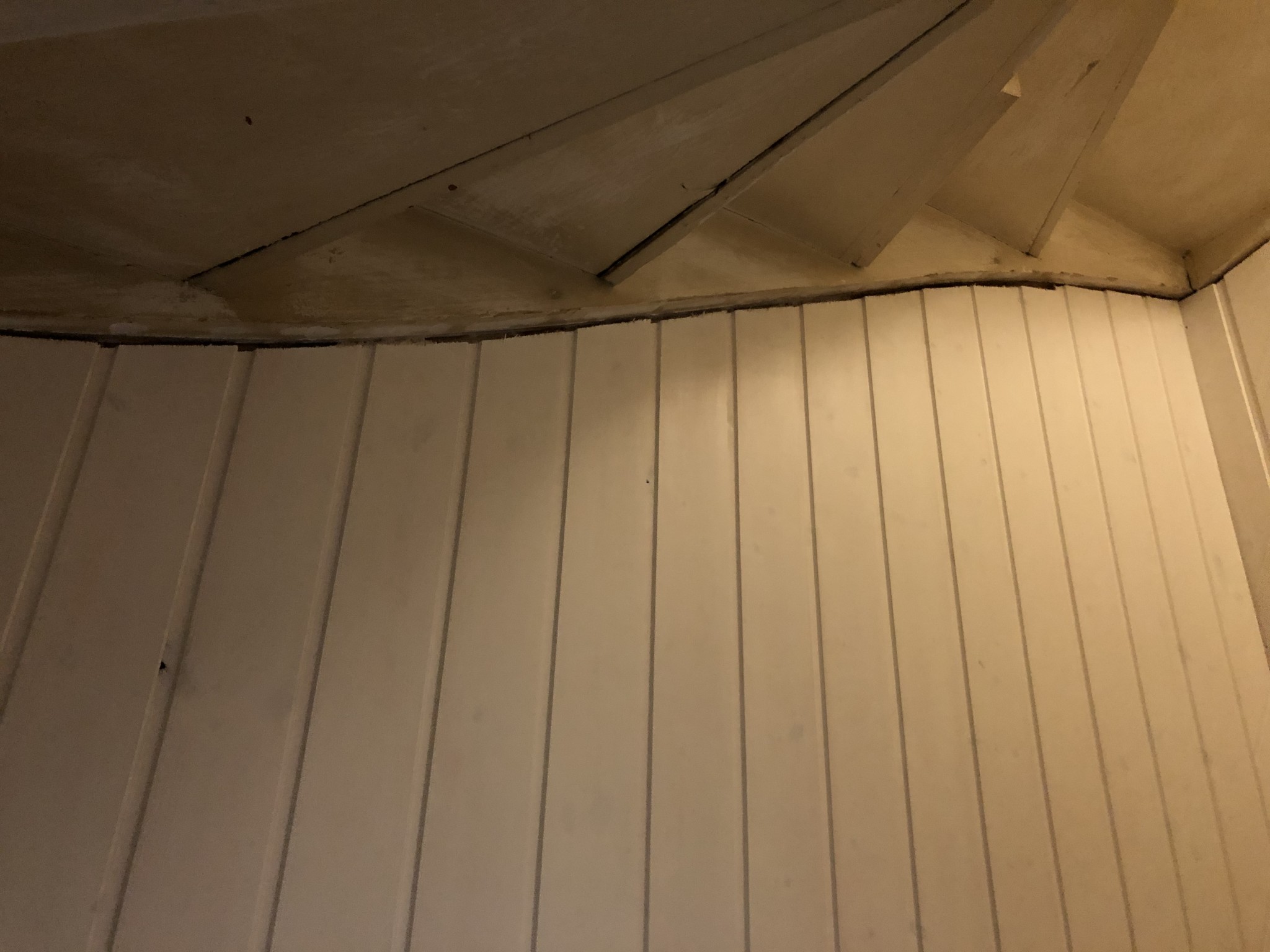 Vi är mitt uppe i en uppfräschning av den gamla och slitna källaren. I trappan ner har vi satt upp pärlspont på väggarna och där har vi nu stött på problem. Då ”taket” dvs trappan till övervåningen lutar så har vi varit behövt kapa av pärlsponten så att den följer lutningen. Det har lett till att vi nu har ett mellanrum på