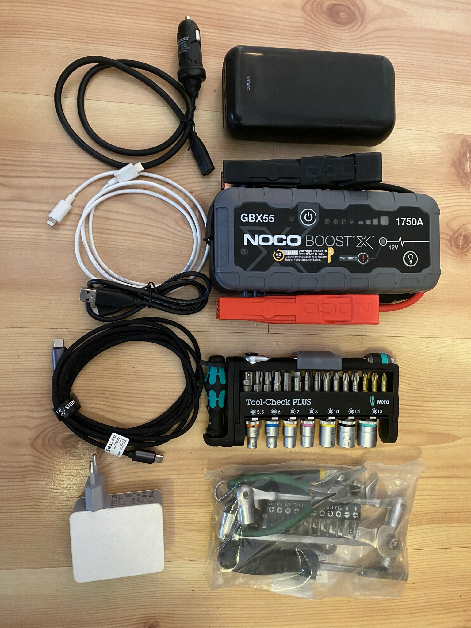 I bilen ligger starthjälpen i tillhörande väska (extratillbehör) tillsammans med en 230V 60 W laddare, 12V 60 W laddare, kablar till att ansluta laddning av laptop och mobiltelefoner samt verktyg. Dessutom finns en extra 108Wh powerbank, som kan anslutas mot ”starthjälpen” via USB-C och laddning kan då ske två vägar.