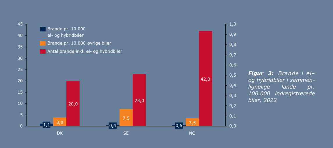 I Danmark brinner det nästan 3 gånger fler el- och hybridbilar per 10000 bilar jämfört med Sverige (1,1 vs 0,4) medan det i Sverige brinner ca dubbelt så många övriga bilar (ej batteribilar) per 10000 bilar jämfört med i Danmark (7,5 vs 3,8). Inte jämförbara siffror men ändå märkliga.