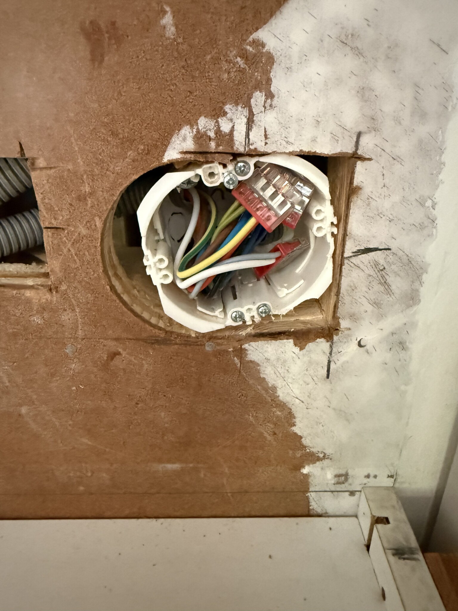Efter att ha påtalat felet kom elektrikern och flyttade dosan, men gjorde det fult. Den hamnade snett, se bild.
