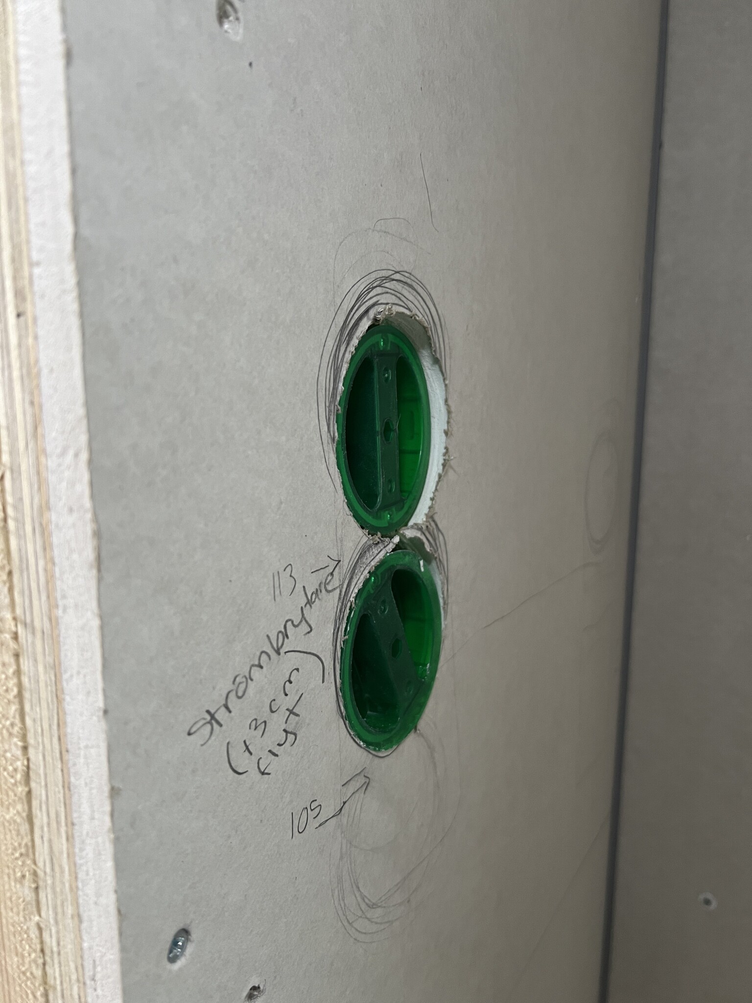 Här ligger strömbrytare i liv med gipsskivan, men plattsättaren kommenterade att han måste kunna trä på en manschett på övriga apparatdosor, vilket inte går då i nuläget. Vi såg också att det saknas dragning ner till andra strömbrytaren som ska styra spegelbelysning/led-lister och det finns inget hål mellan dosorna. Det kanske ska se ut så innan man kopplar på brytare? (Den övre brytaren är för takbelysningen)