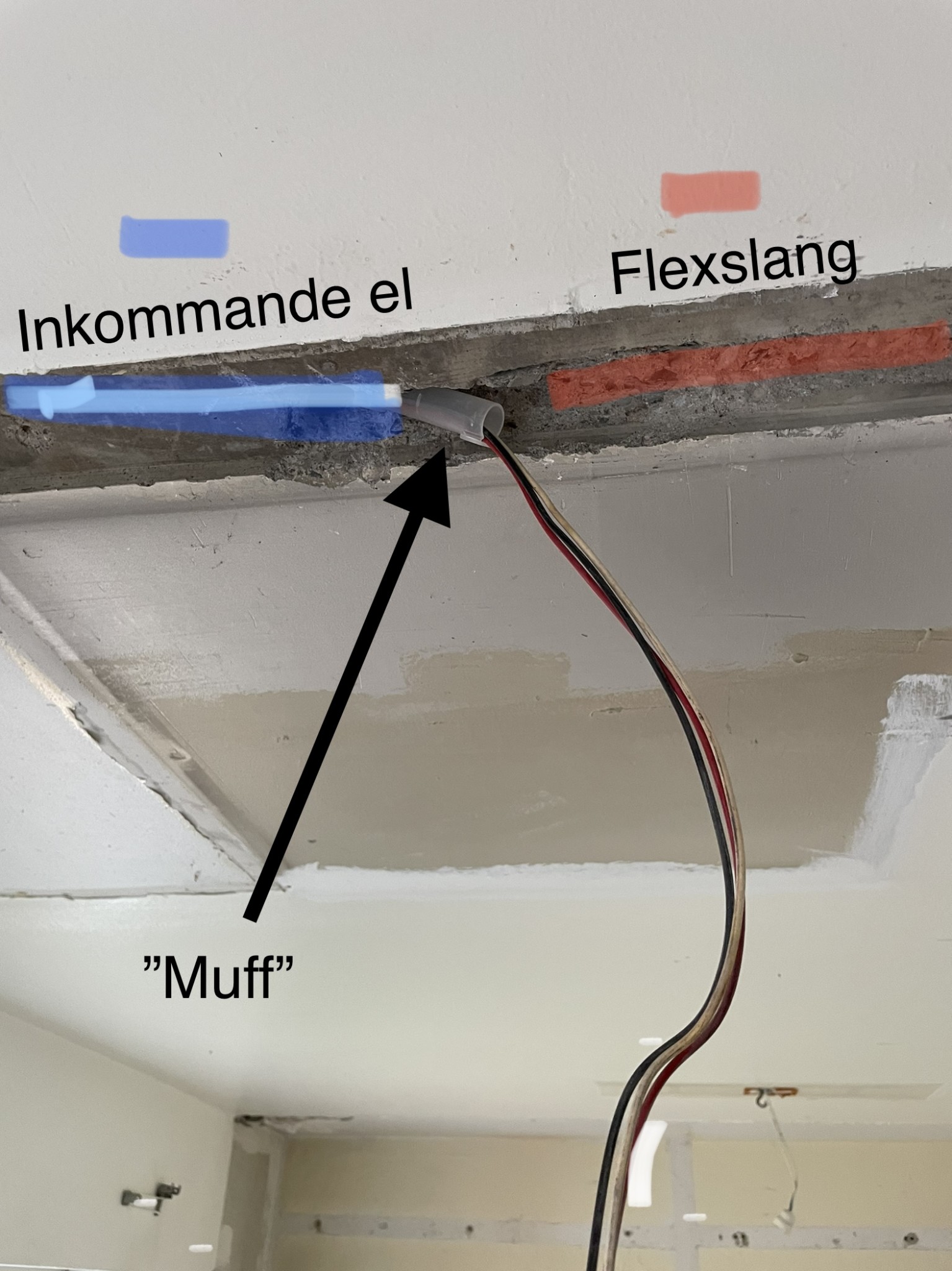 nu till min fråga: elektrikern ska tydligen koppla på en ”muff” på bef. Elledning (kopparrör? Bly?) för att sen dra flexslang i spåren till nya lampan. Fick direktiv om att muffen ska vara stående? Kan väl inte vara möjligt om inkommande el är ingjutet liggande i bjälklaget? Bör väl räcka att bila och spåra så flexslang+muff får plats liggande?