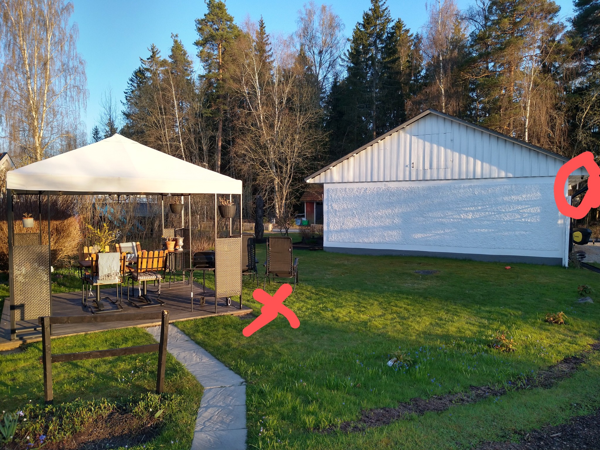 Det finns ett uttag under takfoten på garaget (röd ring) och jag vill ha ett eluttag på en kort stolpe i eller invid paviljongen (rött kryss)