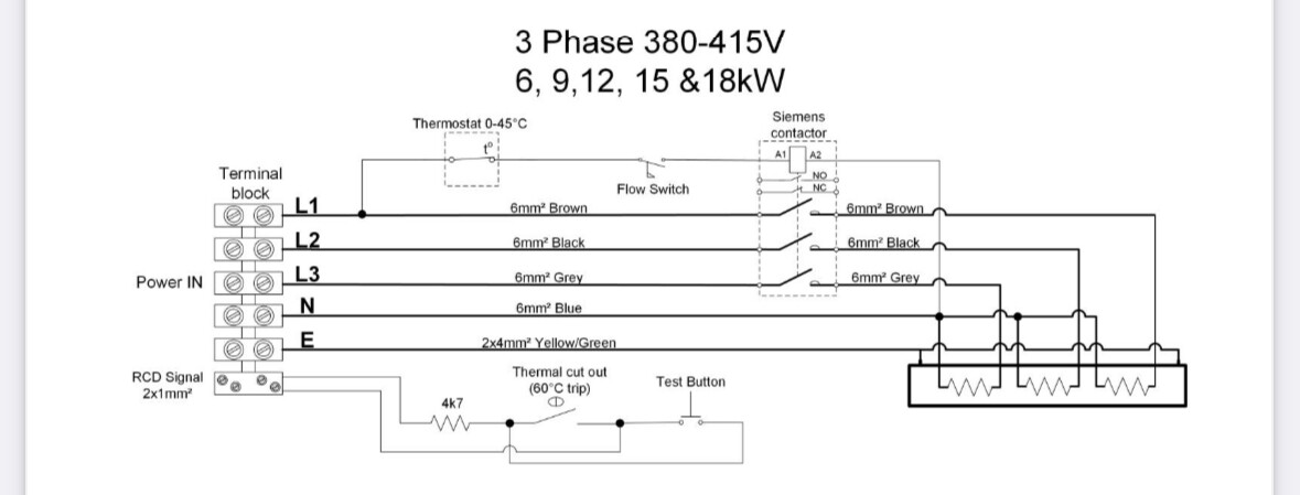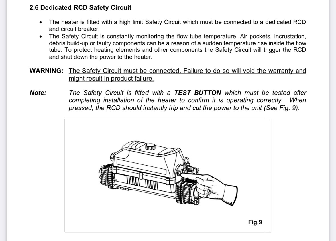 Håller på bygga ihop ett pumphus till badtunna/spabad. Värmaren är en Elecro Evolution 2 på 6 kw, trefas inkoppling. Till höger om plintarna för L1, L2, L3, N och E finns två små plintar märkta med ”RCD signal”. Utifrån min tolkning av scheman så har jag en satt en egen 10A-säkring i pumphusets central där fas och nolla sitter på varsin av dessa plintar (RCD signal). Är detta rätt? För mig väldigt otydliga instruktioner i manualen.