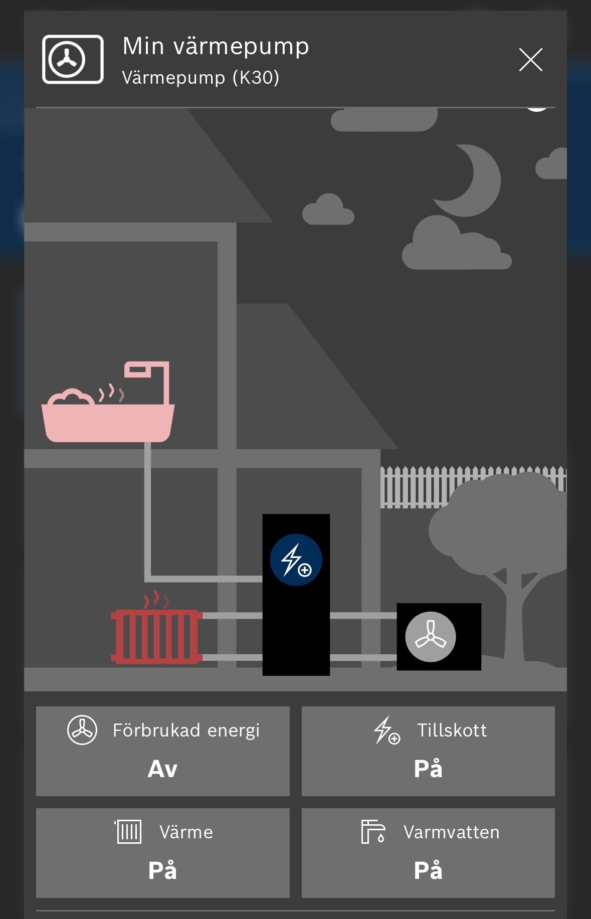 Min säger också att tillskott är på, fast att min panna egentligen inte nyttjat tillskott sen januari 2024. Kollar jag displayen på pannan så visar den inte att tillskottet är aktivt.