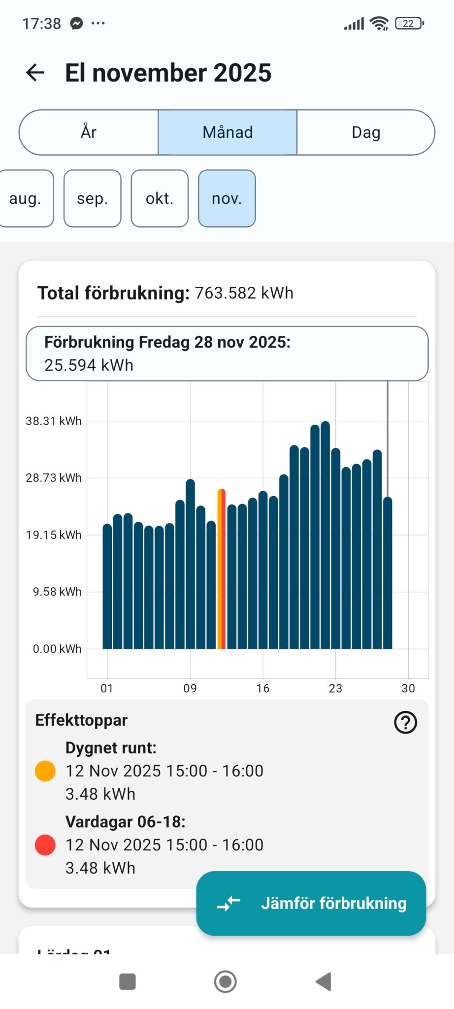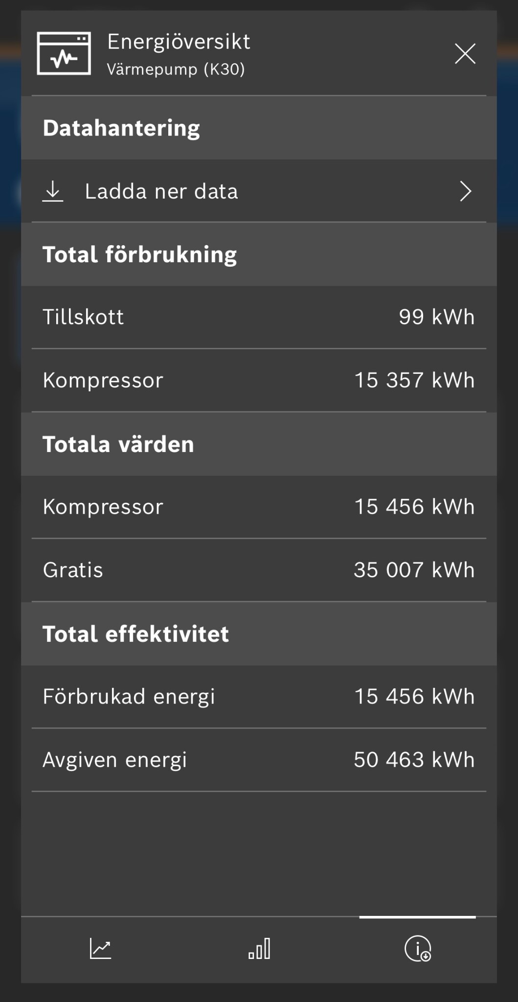 Totalt ca 42 kWh. Fördelat värme. Varmvatten o vent. Ca 25 kWh. Billaddning 7 kWh, o övrigt hushåll ca 10 kWh.F funkisklasse skrev:Undrar lite vad ni har för elförbrukning / dygn ca med era luftvattenpumpar, då menar jag total förbrukning ink hushållsel, senaste veckan när man legat på snitt utetemperatur kanske -2 - -3 gr. 👍🏻 vi har villa, från 1950, souterräng, ca 140 kvm, ni som har liknande boende får gärna meddela era siffror. 👍🏻 vi har dessutom modernt FTX, inga elbilsladdare, frågan ställs då vi ligger på i snitt 90 kWh/ dygn i total hushållsel, när temp är runt 0 ,detta med nyinstallerad IVT luftvattenpump, när man kollar appen visar den nästan alltid ”tillskott på” även vid plusgrader? Detta känns inte normalt