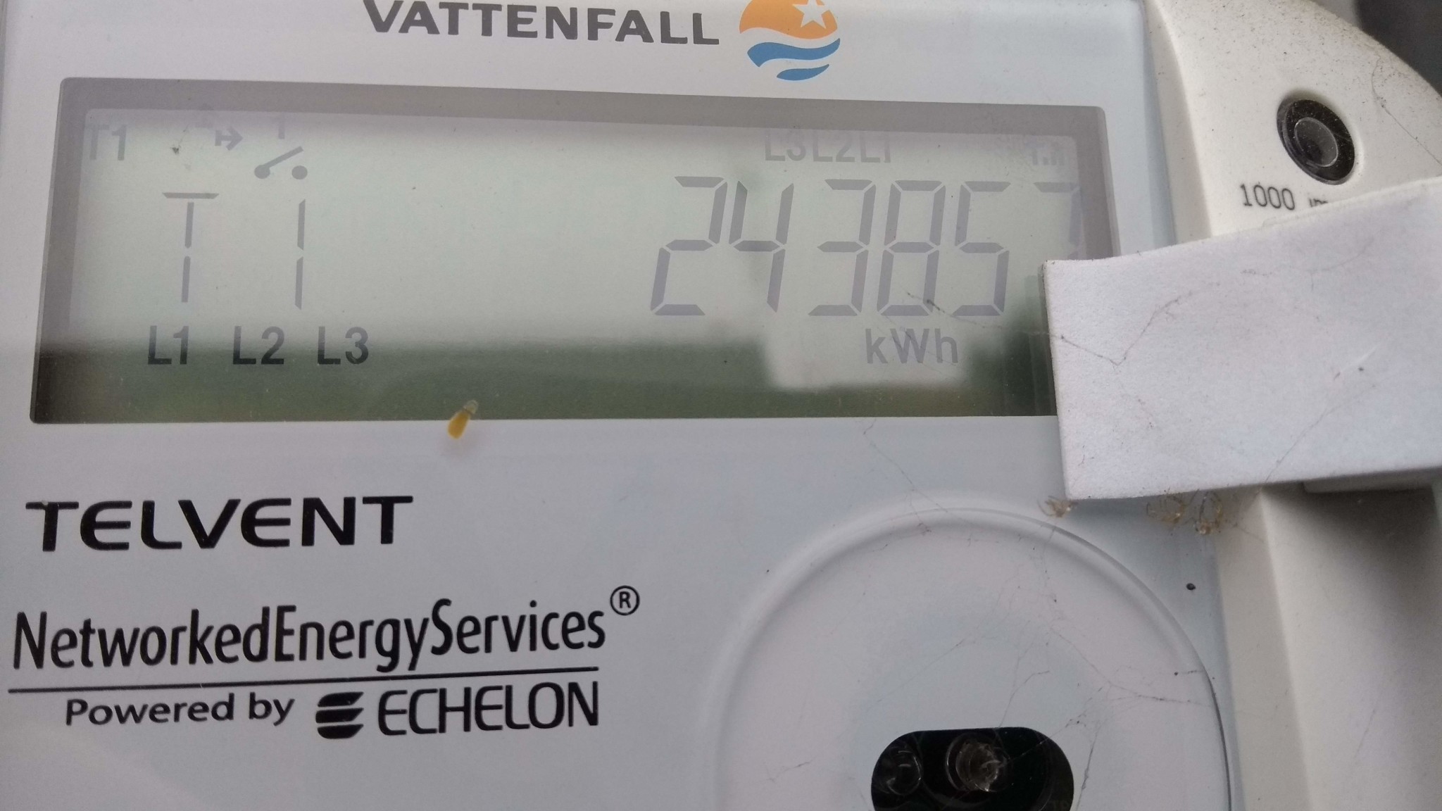 Min mätare (en Landis+Gyr från 2006 som det verkar) visar normalt bara hela kWh och har inga som helst knappar att trycka på. MEN om man bryter strömmen till den så visar den efteråt en stund (15 min?) kWh med en decimal och växlar även mellan att visa spänning per fas.