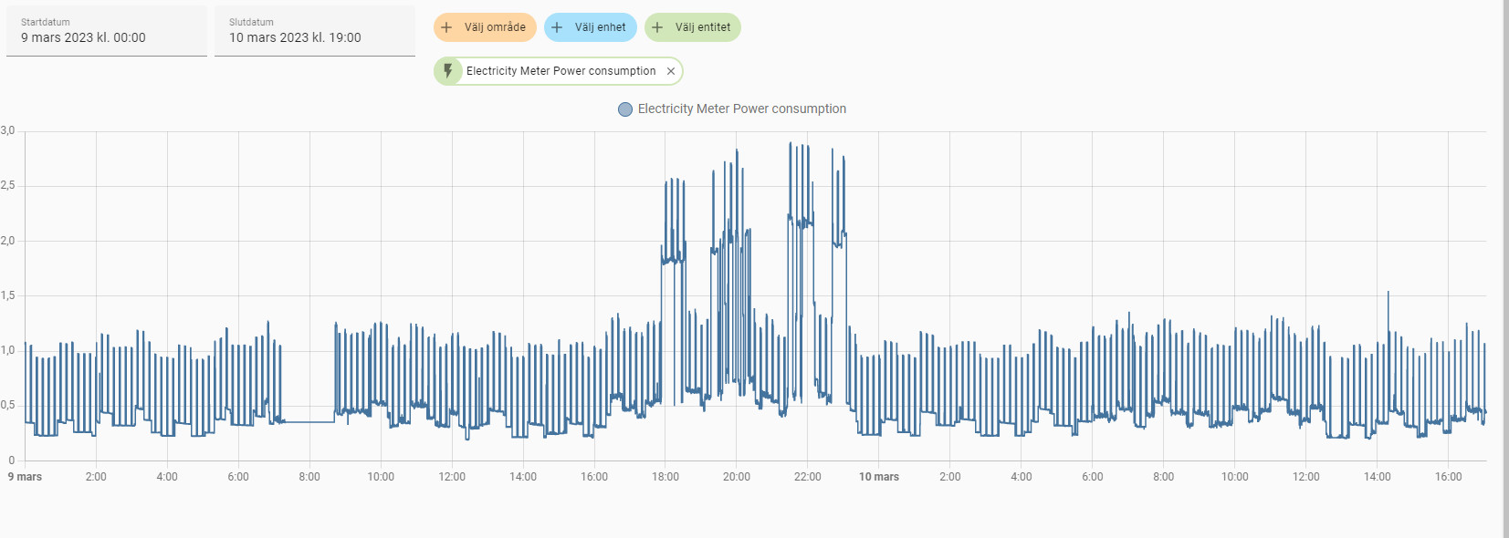Vi förbrukar utan solceller ca 5000 kwh i hushållsel. Jag har märkt att huset nattetid drar 0,3-0,4kw (se bifogad screenshot på dygnsöversikt elförbrukning). Omräknat på årsbasis blir detta ca 2600 kwh som "grund". Jag förstår att kyl/frys etc ständigt drar el, men vi har nyligen bytt dem och inte märkt någon skillnad i förbrukning. Då värme/vatten går på fjärrvärme undrar jag vad mer det kan vara? Inga standby-grejer igång, endast LED-lampor etc.