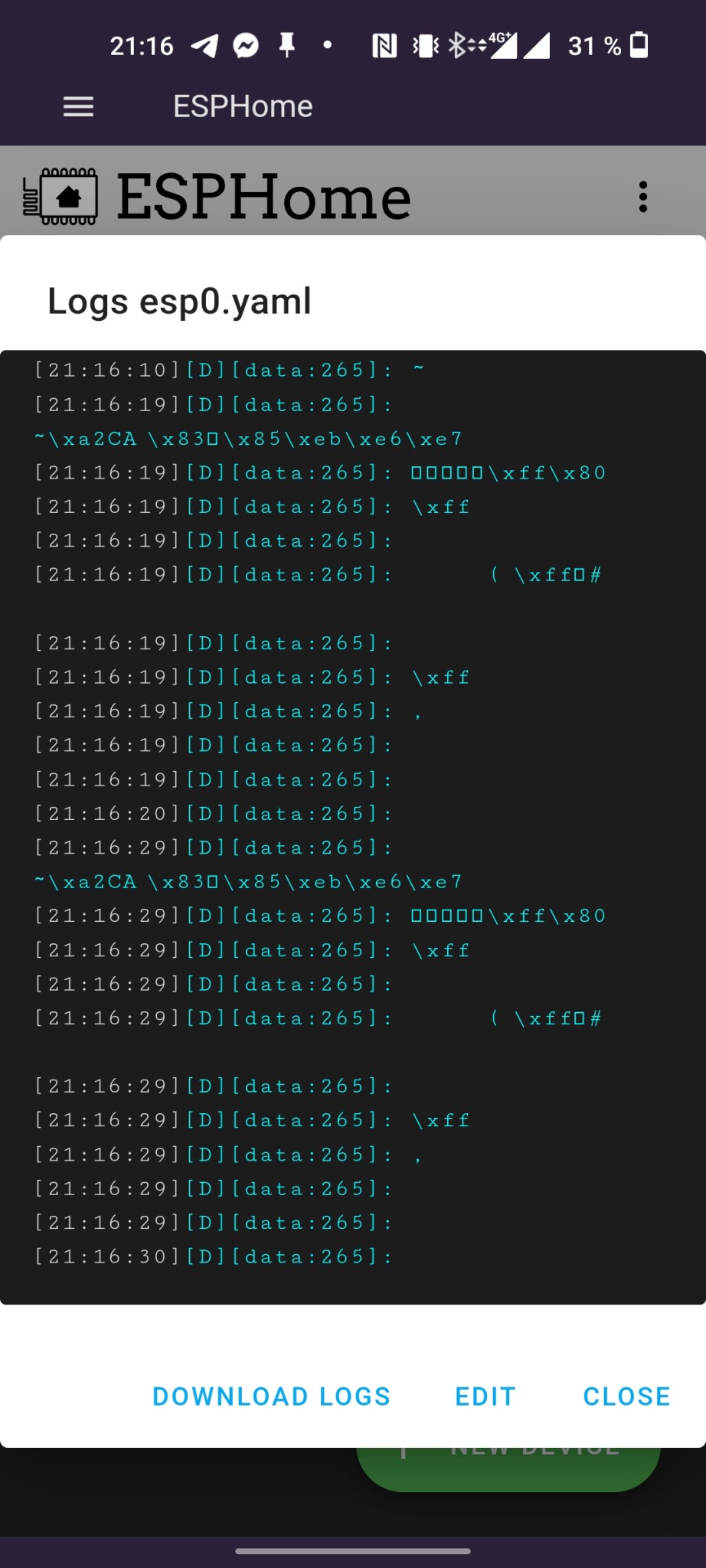 2. Jag är ny inom esphome så ni får ursäkta om jag är lite rookie men när jag flashat färdigt min d1 mini i cmd så kan jag inte läsa ut något från loggen, iaf inte i klartext.. Se bild nedan.. varför blir det så?[bild]