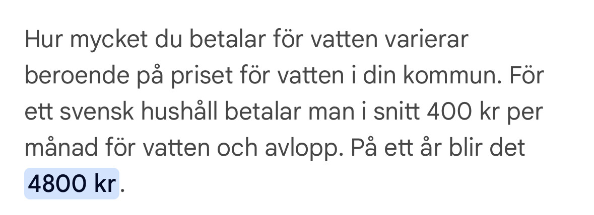 200:- månaden är fortfarande rimlig nivå då en månadsavgift för enbart dricksvatten med kommunal vatten är på typ 181,25/mån + volymavgift 8,7kr/m³ vilket ger 4-personsfamilj och 560 l/dygn * 0.0087kr/l * 30 dagar = 146,16/månad i volymförbrukningskostnad, så 181,25 för fast avgift + 146,16 för vattenvolym = 327,41 kr/månaden, baserad på priser från Södertäljes kommun, och då är avbetalningen av den inledande servis-avgiften (63000:- för en ledning enbart vatten) och förbindelsepunktsavgift (18000:-, en ledning enbart dricksvatten) inte medräknad i detta och denna möjlighet har man bara om man befinner sig inom kommunens vattenverksamhetsområden och det fins ledningar redan nedlagda vid fastighetsgränsen.
