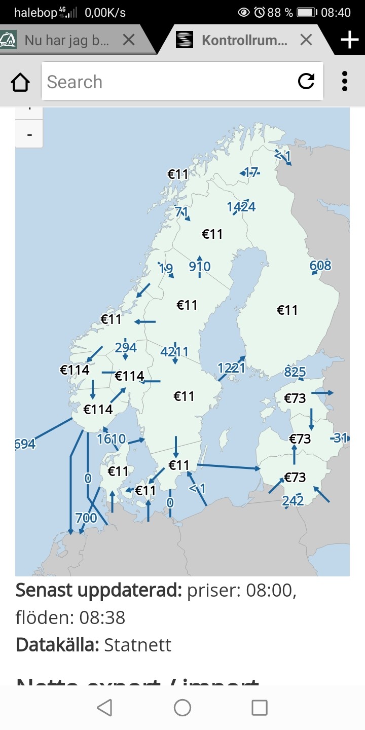 Ja, kablarna till andra länder är ju anledningen att de flesta utom elbolagen tjänar på upplägget med zoner. Så, för egen del ser jag det som bättre med zoner och minimalt med överföringar tills alla länder byggt ut rejält med kraft i sina egna länder. När de närmar sig samma kostnad för el som Sverige så finns förstås fördelar att ha mycket överföringskapacitet både inom och till andra länder för att utjämna när det tex blåser mer eller är mer sol någon annanstans. Tills dess-begränsa överföring inom och till andra länder. Det är främst de andra länderna som är dåliga på att bygga kraftverk. Det ska drabba oss invånare i Sverige så lite som möjligt, då vi har liten möjlighet att påverka tex Tyskland. Ju bättre överföring vi i Sverige har, desto billigare blir elen till Tyskland och incitamentet att bygga kraftverk blir då mindre för dem.Maskintok skrev: