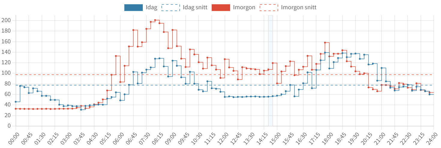 På stigande priser är det sista kvarten på timmen som är dyrast, på sjunkande priser så är det den första kvarten som hoppar iväg. Jag gissar att det beror på att man har en algoritm som räknar ut vilka kvartspriser man skall buda med som har timalgoritmerna som bas.P paralun skrev:
