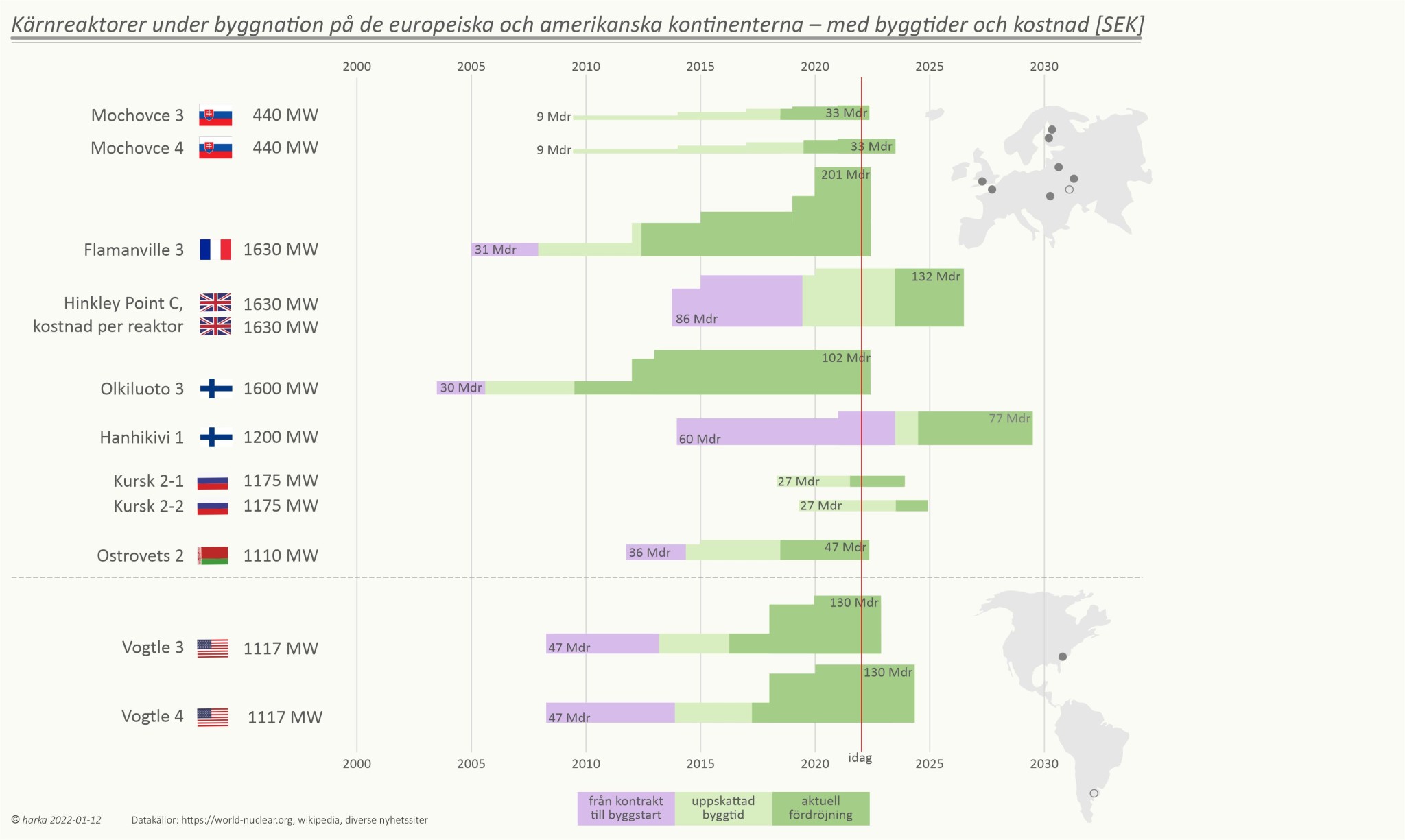 grafiken nedan tar upp samtliga kärnreaktorer – varken mer eller mindre (nåja, nästan i alla fall) – som är under byggnation på de europeiska och amerikanska kontinenterna