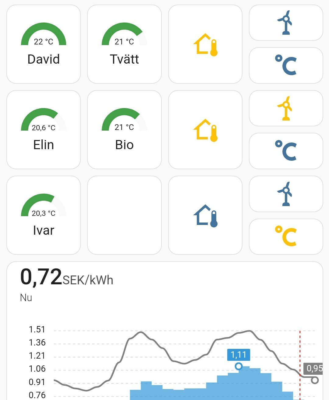 Jag har i första hand luft/luftvärmepump, men i de tre sovrummen har jag vanliga element eftersom värmen från pumpen inte alltid når fram i tillräcklig mängd. Nu har jag gjort så att jag sätter en brytnivå manuellt med en helper i HA. Att jag gör det manuellt är helt enkelt så att det känns alldeles för komplext att försöka få till en algoritm som kan ta hänsyn till allt min hjärna kan. Tex hur kallt det är ute, vem som är hemma eller borta och när någon planeras att komma hem osv. Det kan bli så att jag justerar nivån ett par ggr/dag. Om elpriset går över brytnivån kopplas elementen ur så att jag är säker på att den värme som produceras i huset då kommer från luftvärmepumpen. Så länge elpriset ligger över nivån tillåts temperaturen i sovrummen att sjunka till 18 grader innan elementen automatiskt kopplas in igen. Dels för komforten men också för att inte riskera att gå under 16 grader och få kondens i skivsamlingen osv... 😃