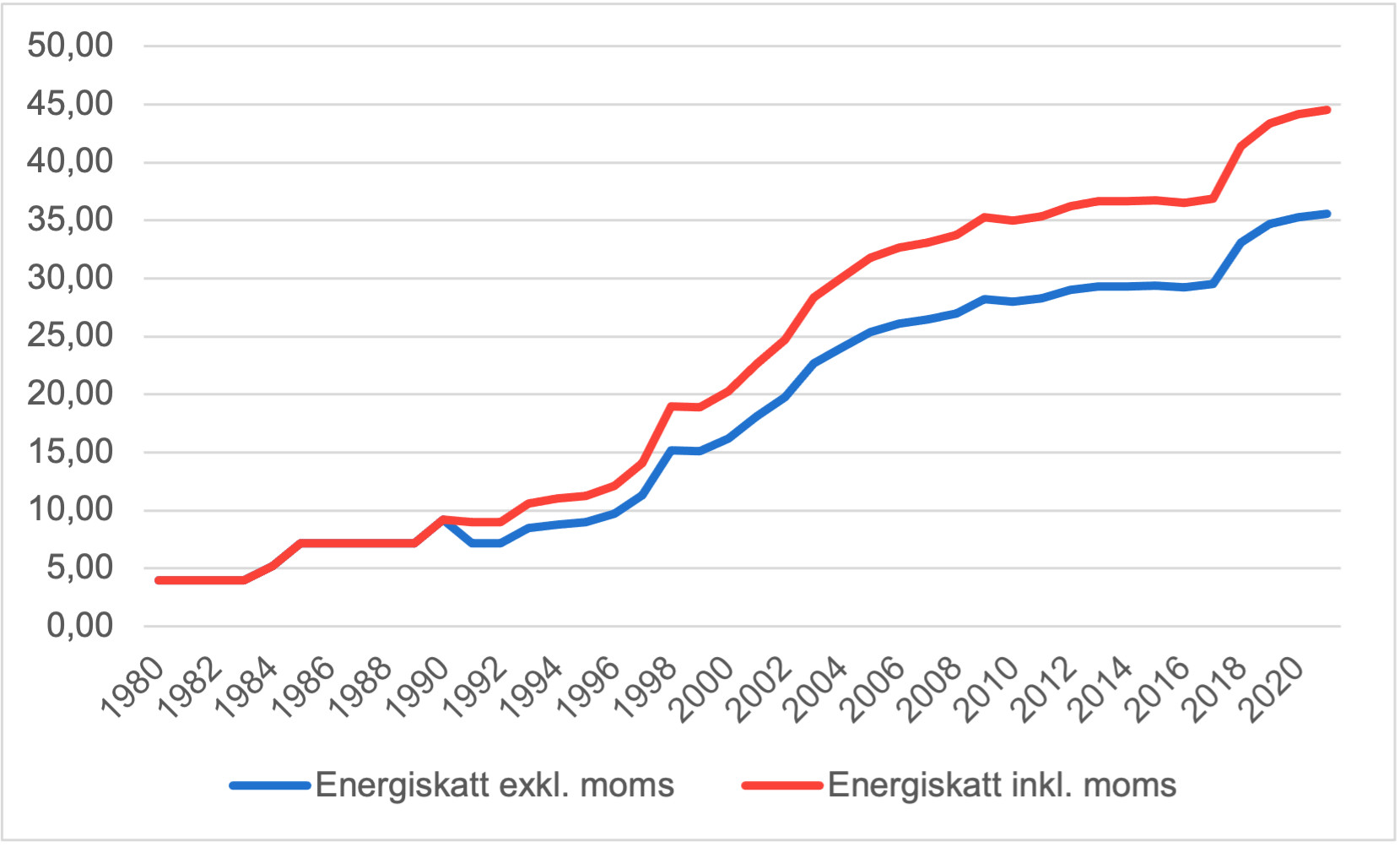 Numera indexuppräknas skatten varje nytt årsskifte efter ett politiskt beslut i riksdagen. För 2022 är skatten 44,5 öre per kWh. Vilket innebär en skattekostnad på ca 9 000 kr per år för ett hushåll som förbrukar 20 000 kWh/år.