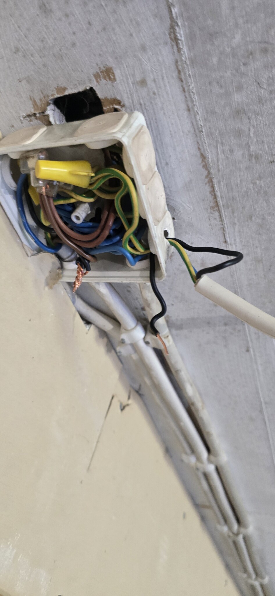 Denna härva av sladdar finns i mitt kallgarage. Den vita hängande sladden leder till ett extra uttag i taket. Ska ta bort detta uttag. Klipper jag sladden rakt av och lindar med eltejp runt varje sladd (fas, jord etc). Eller hur skulle ni gjort som säkrast sätt?